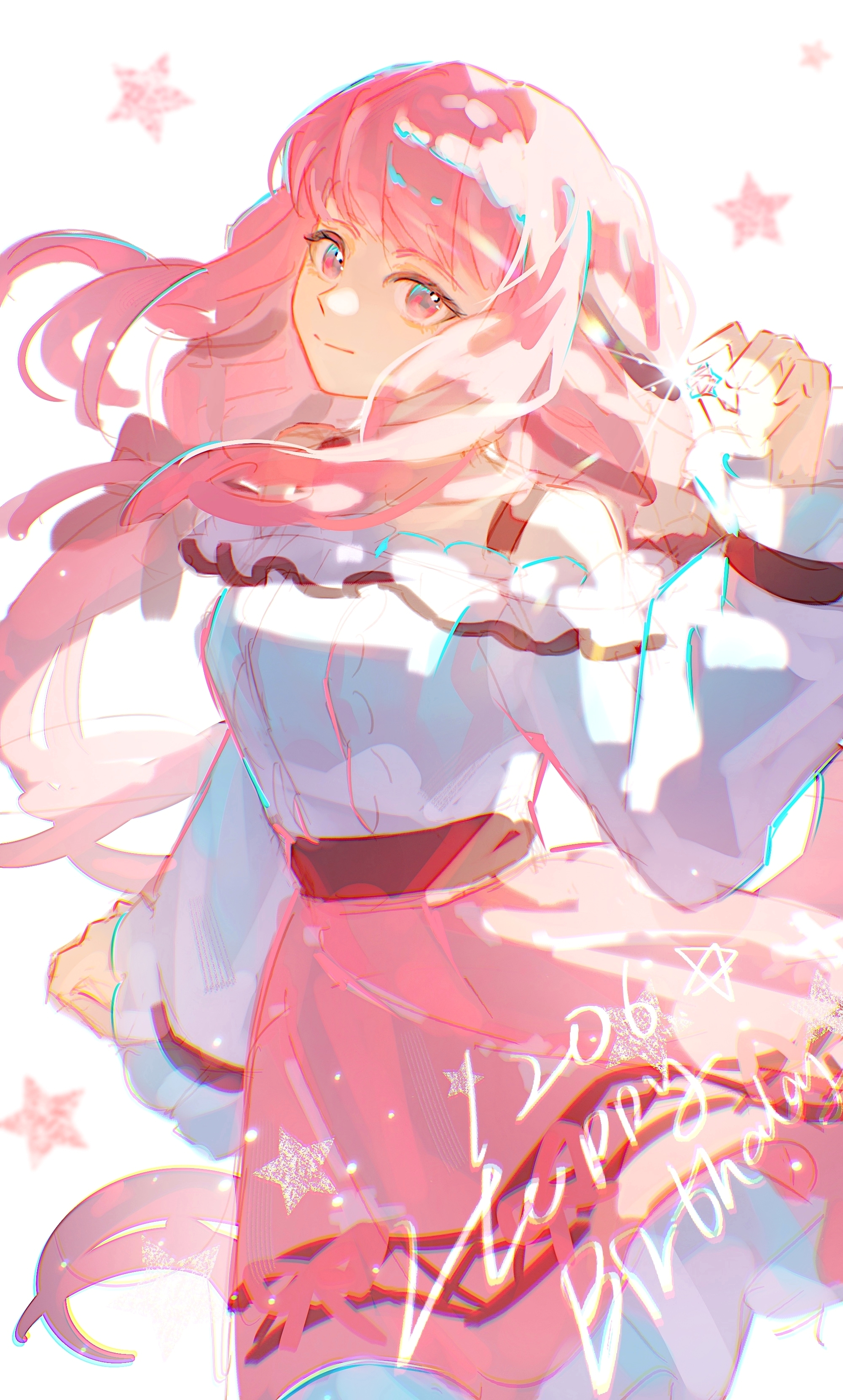 1girl absurdres bare_shoulders black_bow black_ribbon bow bra_strap center_frills chalkboard chinese_commentary closed_mouth commentary commentary_request cowboy_shot dated english_commentary floating_clothes floating_hair frilled_shirt frilled_skirt frilled_sleeves frills hair_bow hair_ribbon happy happy_birthday head_tilt highres holding holding_star infinity_nikki light_particles long_hair long_sidelocks long_sleeves looking_at_viewer low_twintails miniskirt nikki_(nikki) nikki_(series) off-shoulder_shirt off_shoulder perfect_start_(infinity_nikki) pink_eyes pink_hair pink_skirt pointy_nose print_skirt puffy_long_sleeves puffy_sleeves ribbon shen_shen_ruqi shirt sidelocks skirt smile snowflake_print solo standing star_(sky) star_(symbol) star_symbol_background tress_ribbon twintails very_long_hair wavy_hair white_background white_shirt