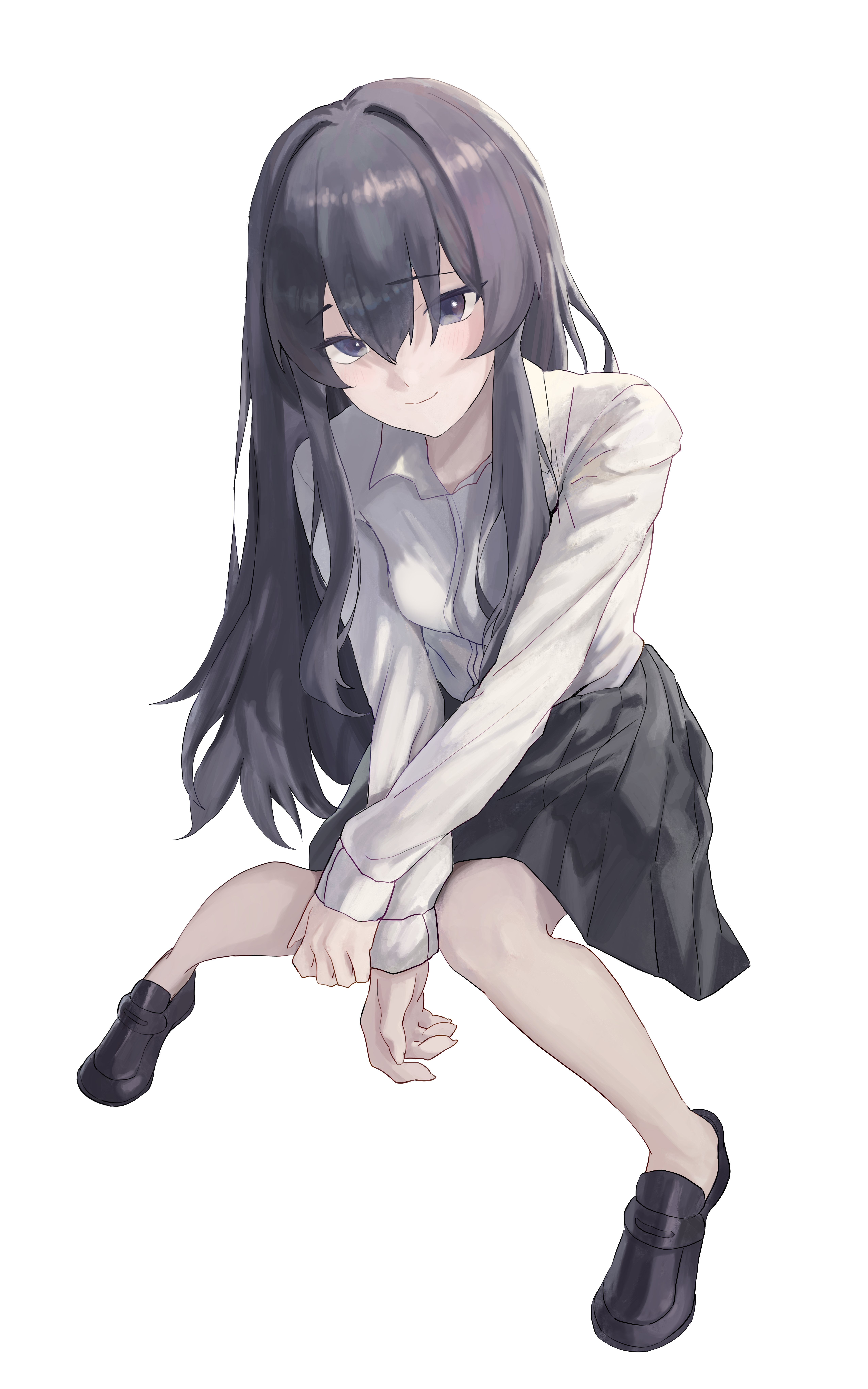 1girl absurdres alternate_costume alternate_hairstyle black_eyes black_hair black_shoes black_skirt closed_mouth collared_shirt commentary_request full_body highres invisible_chair kageyama_izumi knees_together_feet_apart long_hair long_sleeves looking_at_viewer pleated_skirt shirt shoes simple_background sitting skirt white_background white_shirt yahari_ore_no_seishun_lovecome_wa_machigatteiru. yukinoshita_yukino