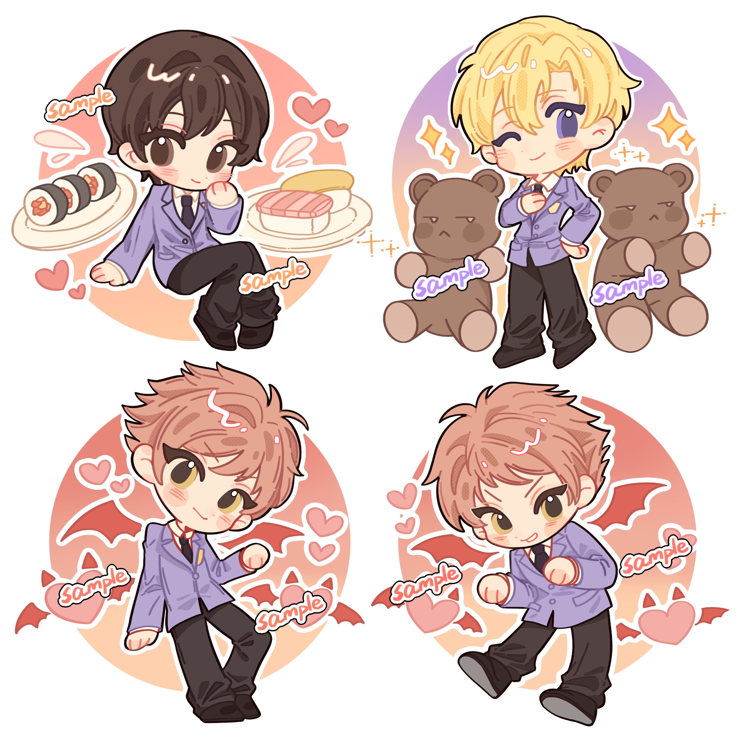 1girl 3boys absurdres androgynous bingjilingpaopao bishounen black_necktie blazer blonde_hair brothers brown_eyes brown_hair chibi chibi_only chinese_commentary commentary_request commission crossdressing crossdressing_(ftm) demon_wings food fujioka_haruhi heart highres hitachiin_hikaru hitachiin_kaoru jacket multiple_boys necktie one_eye_closed ouran_high_school_host_club ouran_high_school_uniform procreate_(medium) purple_eyes purple_jacket red_hair reverse_trap sample_watermark school_uniform siblings stuffed_animal stuffed_toy suou_tamaki sushi teddy_bear twins watermark wings yellow_eyes