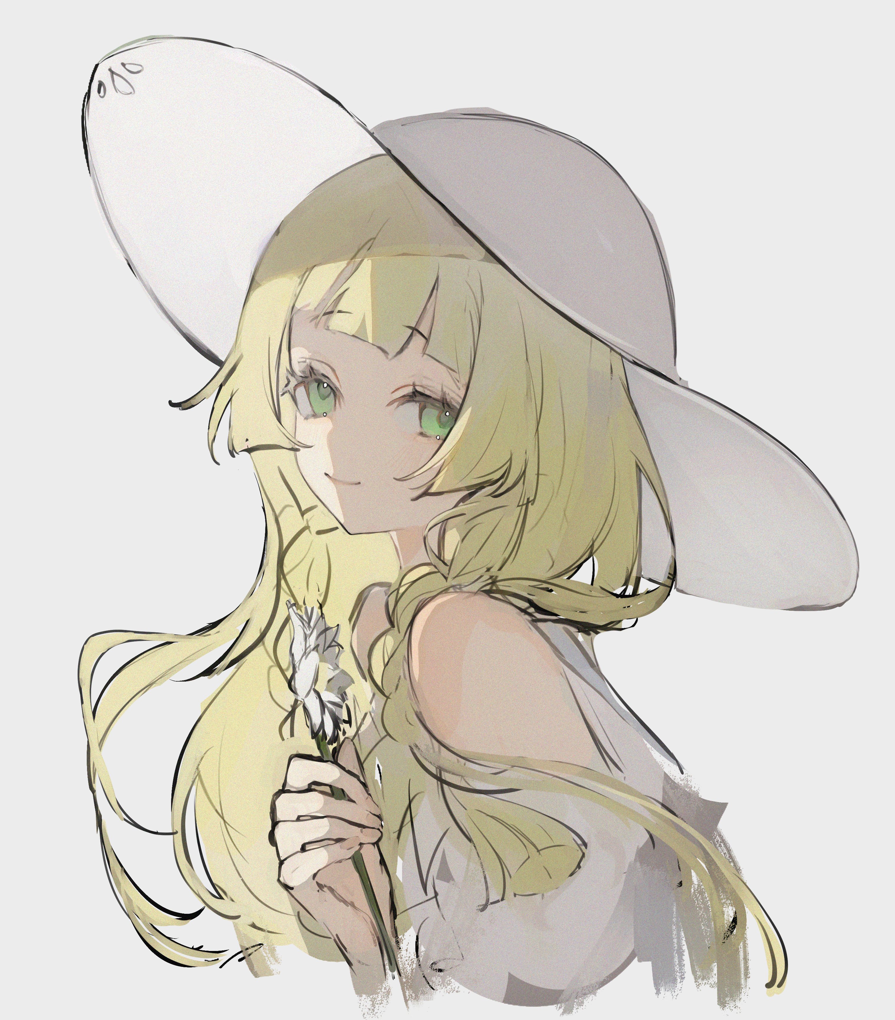 1girl absurdres bare_shoulders blonde_hair blunt_bangs closed_mouth fingernails flower green_eyes hand_up hat highres holding holding_flower lillie_(pokemon) long_hair looking_at_viewer nintendo pokemon pokemon_sun_and_moon simple_background smile solo toke_ino upper_body white_background white_hat