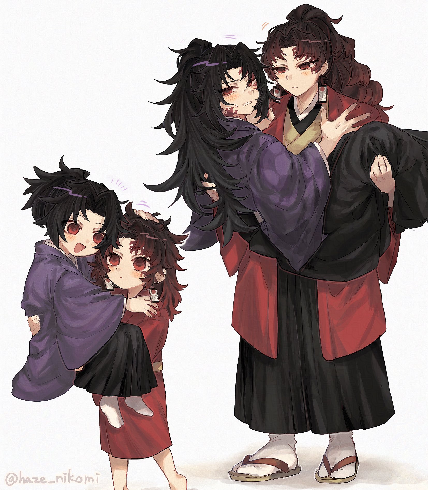 2boys age_comparison aged_down barefoot black_hair black_hakama blush brown_hair carrying carrying_person chihaze_mizu59 clenched_teeth closed_mouth full_body hakama haori high_ponytail highres japanese_clothes kimetsu_no_yaiba kimono male_focus multiple_boys open_mouth ponytail purple_kimono red_eyes red_haori red_kimono simple_background smile socks spiked_hair standing teeth tsugikuni_michikatsu tsugikuni_yoriichi twitter_username white_background white_socks yellow_kimono
