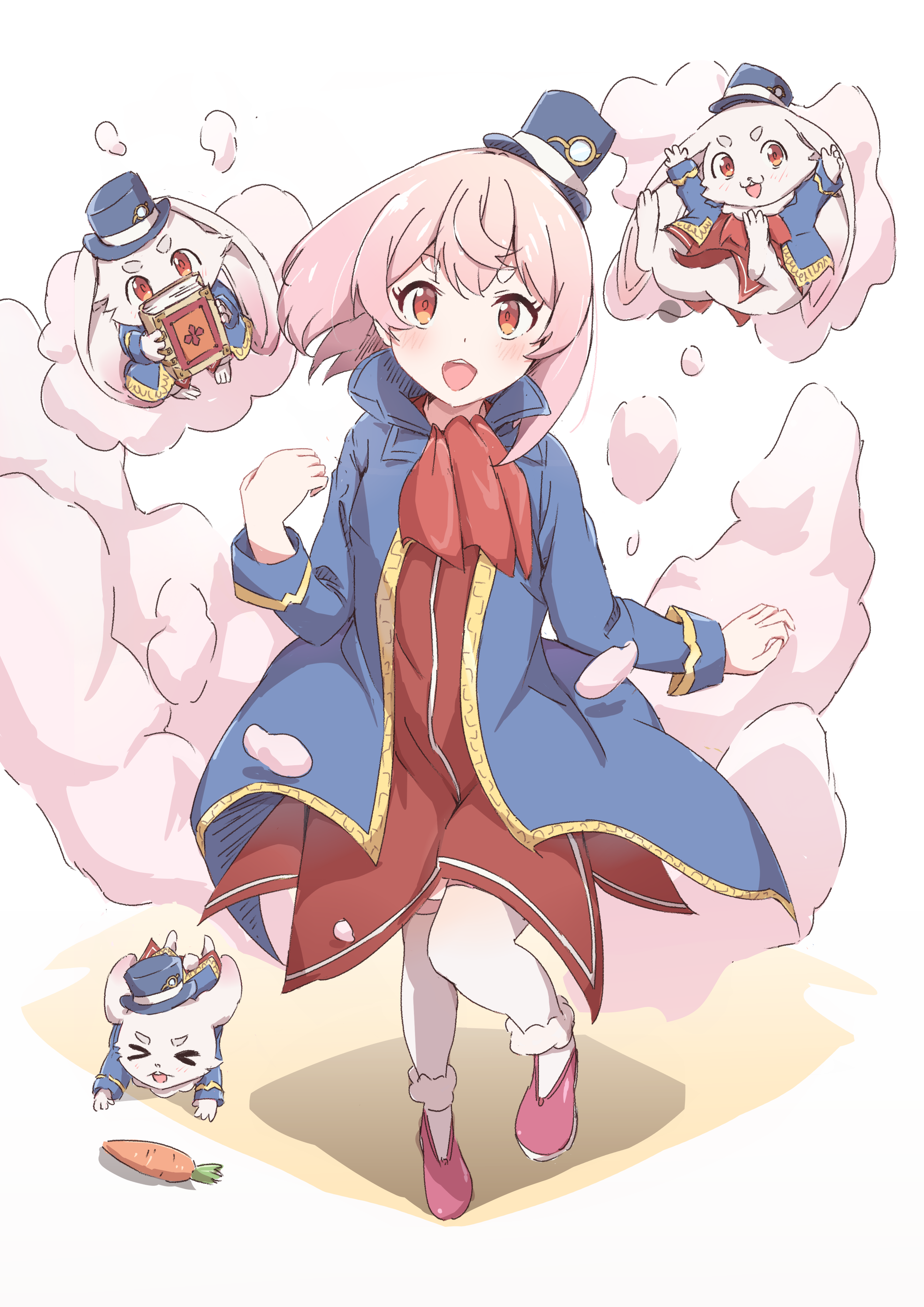 absurdres bad_id bad_pixiv_id blush book carrot emul_(shangri-la_frontier) hat hidaka_rina highres holding holding_book kaai_yuu open_mouth pink_shoes rabbit red_eyes shangri-la_frontier shoes short_hair smile smoke thighhighs top_hat white_thighhighs