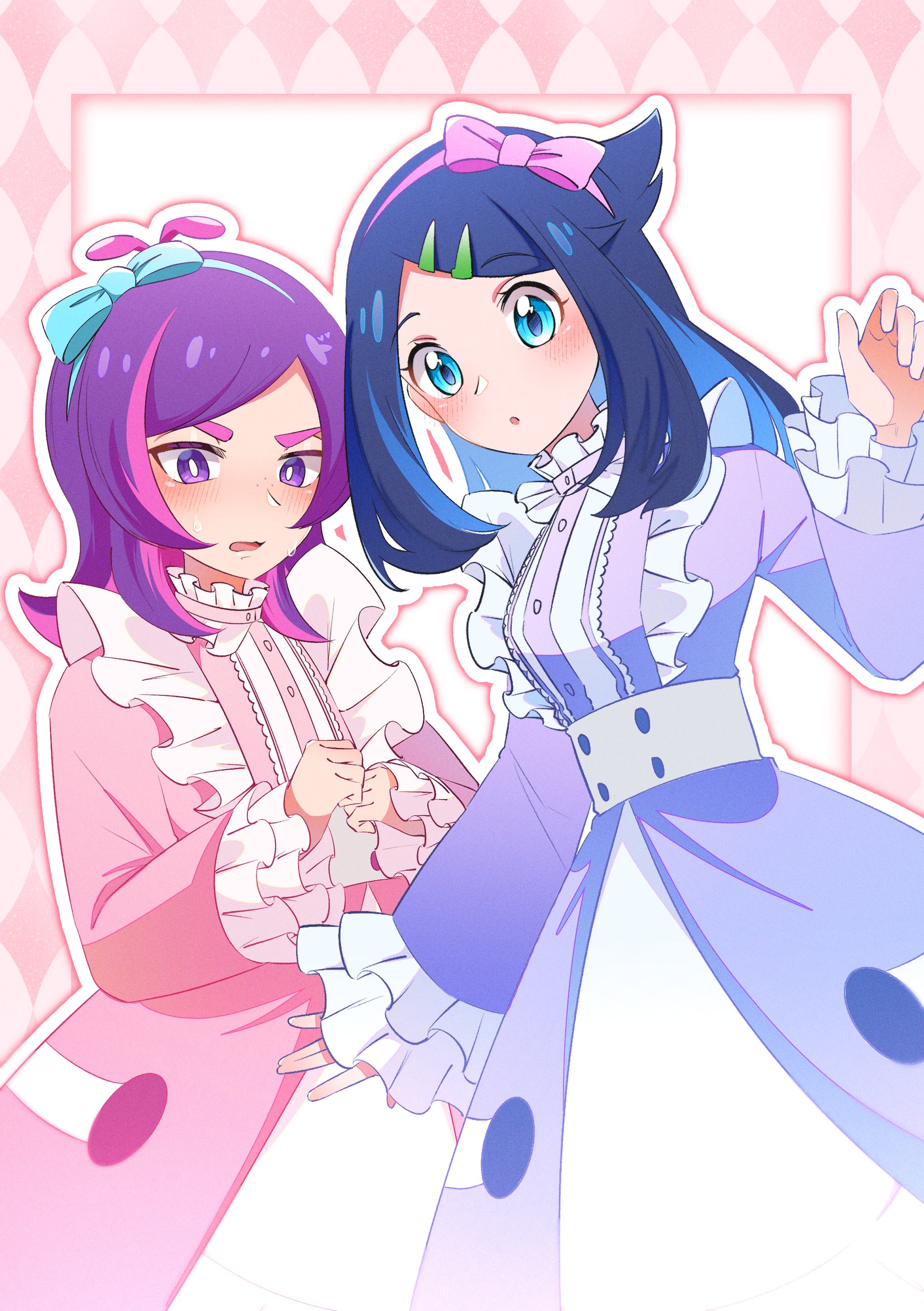 2girls absurdres black_hair blue_dress blue_eyes blue_hair blush colored_inner_hair cowlick dot_(pokemon) dress eyelashes frilled_dress frills hair_ornament hair_ribbon hairclip highres liko_(pokemon) long_hair long_sleeves looking_at_viewer mikan_bako multicolored_hair multiple_girls nintendo open_mouth pink_dress pink_hair pokemon pokemon_(anime) pokemon_horizons puffy_sleeves purple_eyes purple_hair ribbon smile sweatdrop two-tone_hair