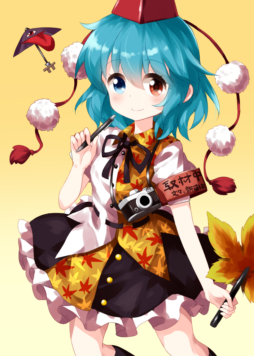 1girl armband belt black_ribbon black_skirt black_socks blue_eyes blue_hair blush camera commentary cosplay frills hair_between_eyes hand_fan hat hauchiwa heterochromia highres karakasa_obake kneehighs leaf maple_leaf neck_ribbon one-hour_drawing_challenge pen pom_pom_(clothes) red_eyes ribbon ruu_(tksymkw) shameimaru_aya shameimaru_aya_(cosplay) shirt short_hair short_sleeves simple_background skirt smile socks solo tatara_kogasa tokin_hat tongue tongue_out touhou umbrella white_shirt
