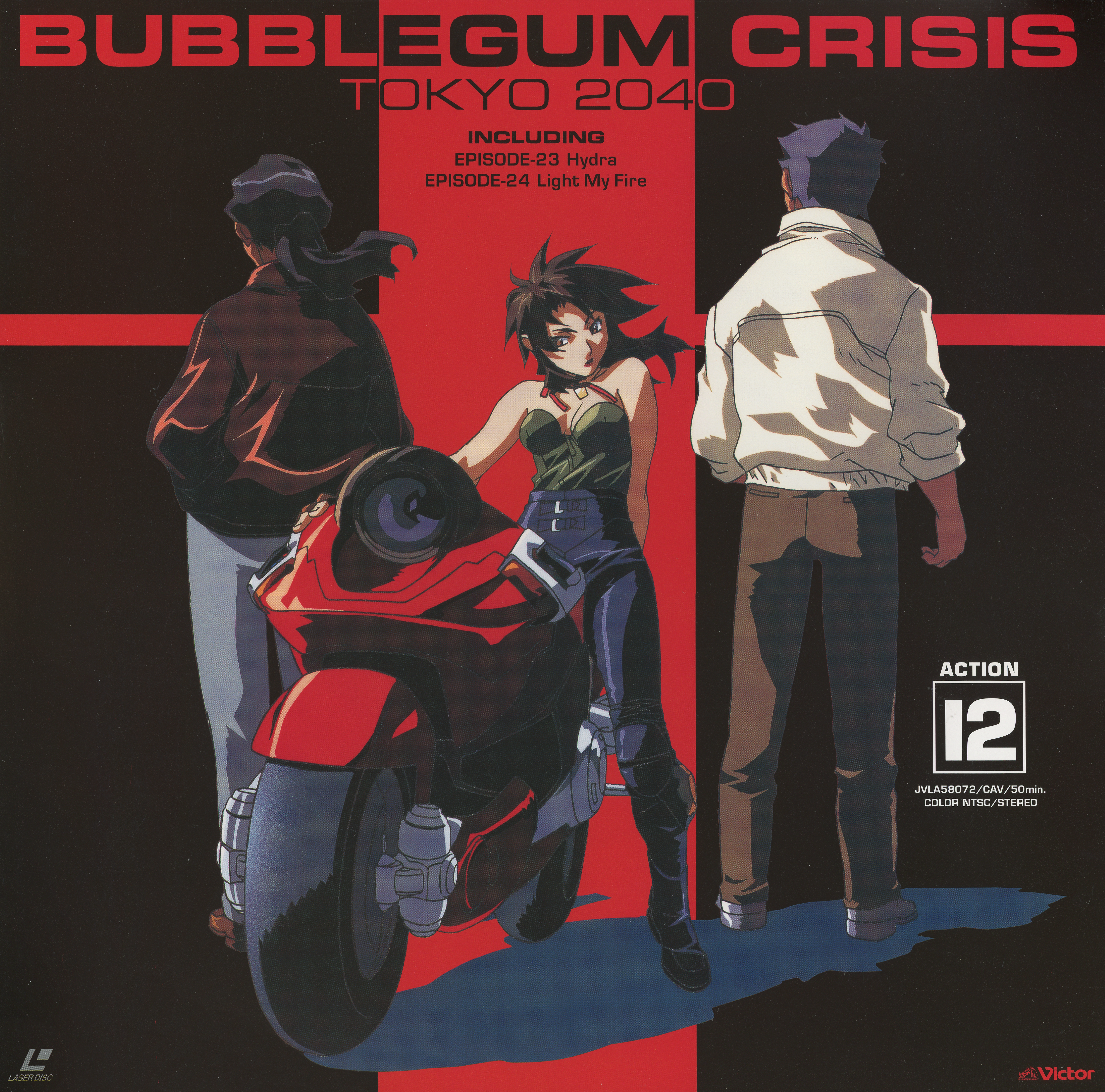 1990s_(style) 1girl 2boys absurdres back breasts bubblegum_crisis_2040 cape character_name cleavage collarbone full_body highres jacket laserdisc_cover leon_mcnichol leon_mcnichol_(bubblegum_crisis_2040) long_hair motor_vehicle motorcycle multiple_boys official_art open_clothes open_jacket pants priscilla_asagiri priscilla_asagiri_(bubblegum_crisis_2040) retro_artstyle scan short_hair spiked_hair two-tone_background yamada_masaki