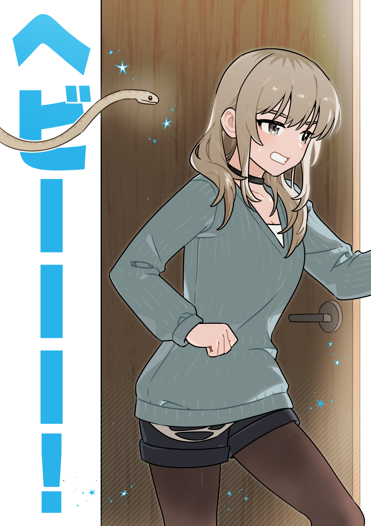 1girl black_choker black_pantyhose black_shorts blue_sweater breasts choker cleavage commentary_request girls_band_cry grey_eyes grey_hair habsida_(habsida_hpy) highres kawaragi_momoka long_sleeves multicolored_hair open_mouth pantyhose pantyhose_under_shorts roots_(hair) shorts sidelocks snake solo sweatdrop sweater translated