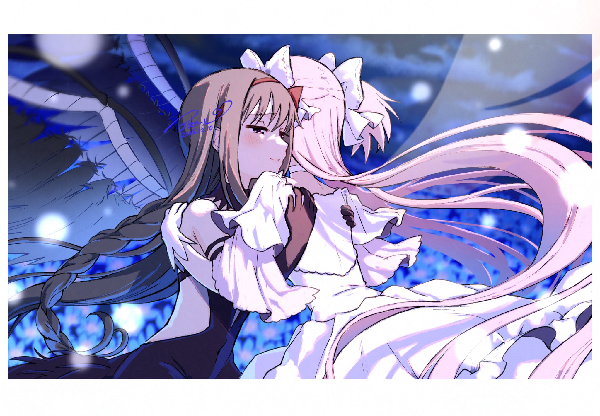 2girls akemi_homura asukaru_(magika_ru) black_gloves black_hair border bow braid closed_mouth dated dress frilled_dress frills gloves hair_bow hairband highres hug kaname_madoka long_hair long_sleeves mahou_shoujo_madoka_magica mahou_shoujo_madoka_magica_(anime) multiple_girls pink_hair red_hairband signature two_side_up ultimate_madoka upper_body white_border white_bow white_dress white_gloves