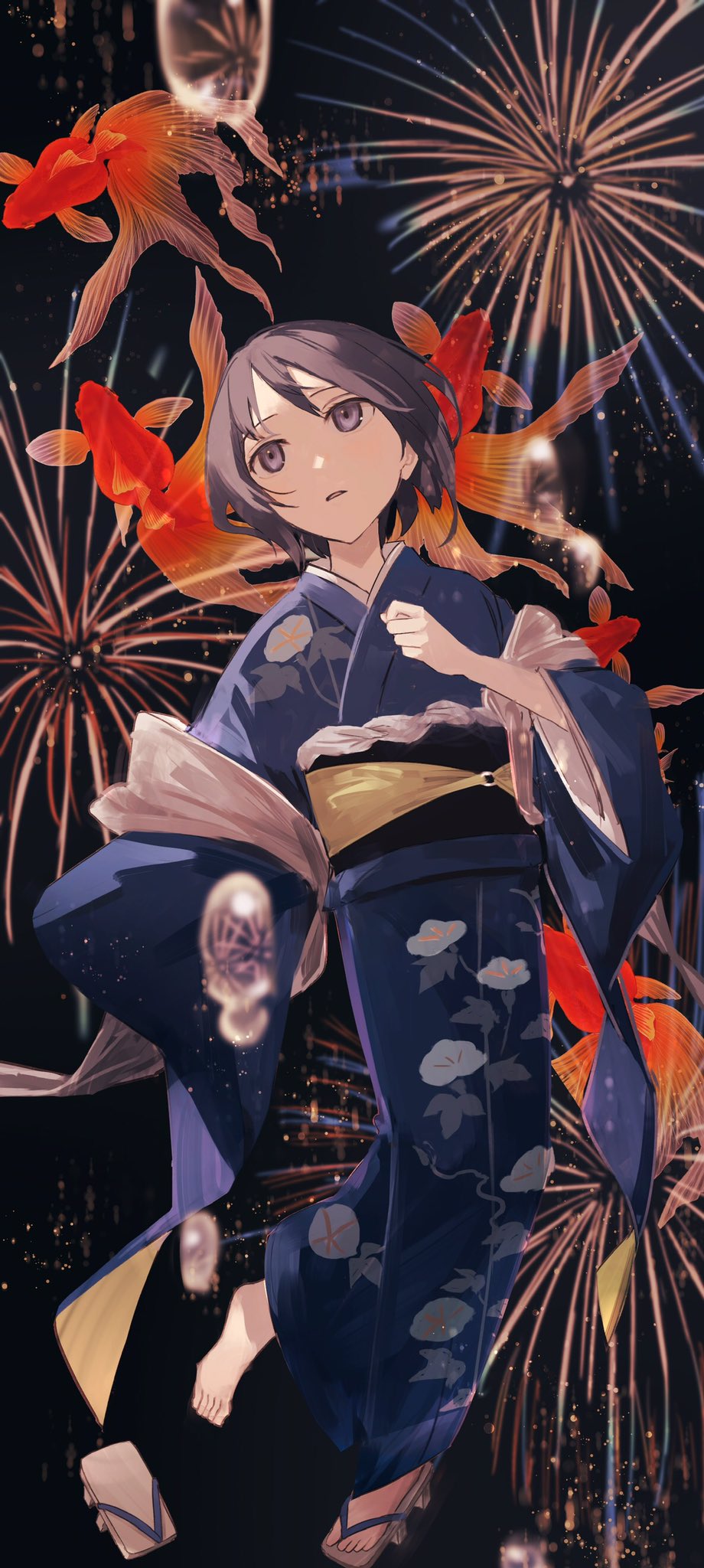 1girl aerial_fireworks alt_(apou) black_hair blue_kimono commentary_request festival fireworks fish floral_print floral_print_kimono full_body geta goldfish grey_eyes hand_on_own_chest hand_up highres japanese_clothes kimono long_sleeves looking_up night obi obiage original outdoors parted_lips print_kimono sash shoes short_hair single_shoe sky solo standing standing_on_one_leg stole summer summer_festival wide_sleeves yukata