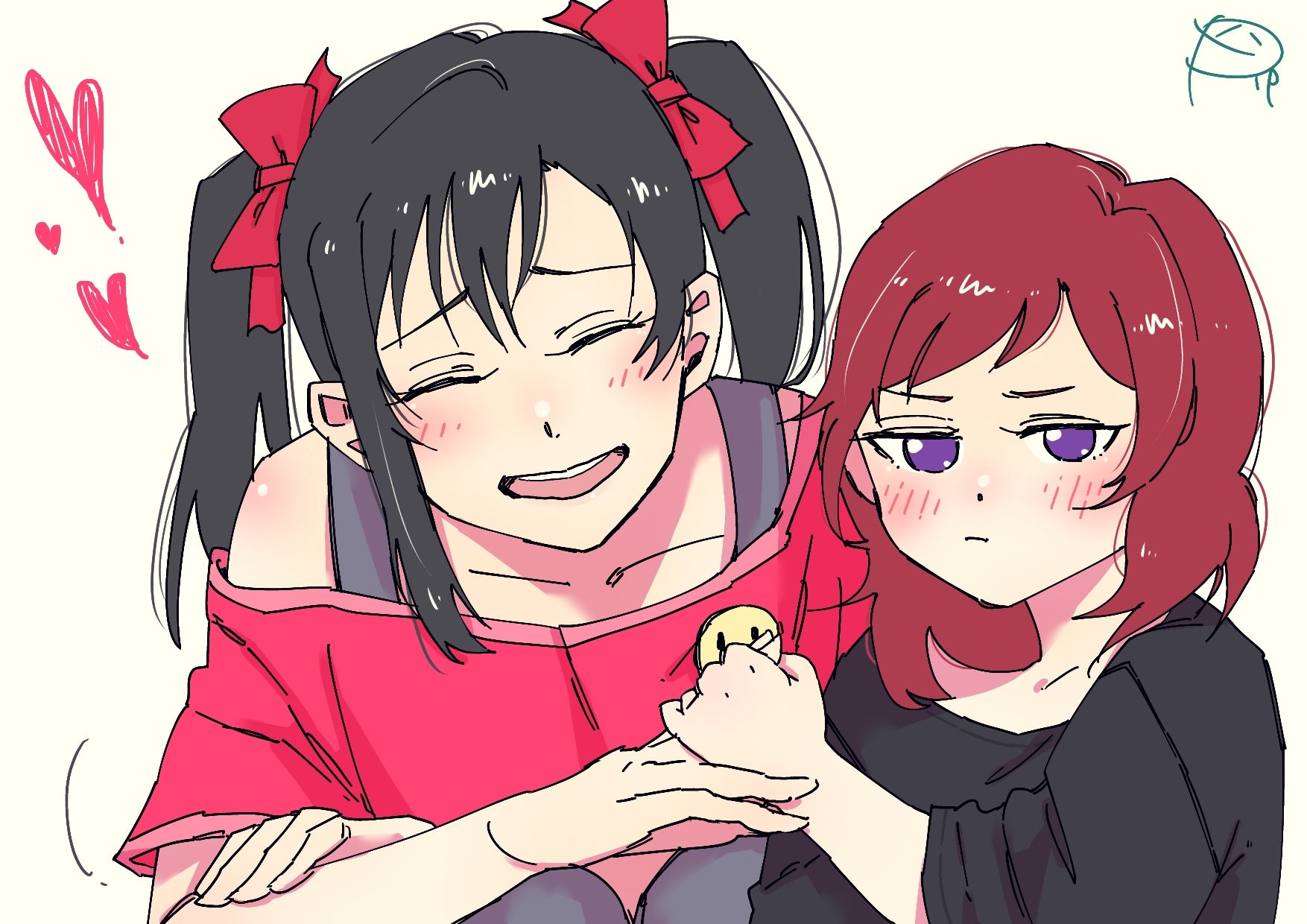 2girls aged_down black_hair black_shirt blush child closed_eyes commentary_request heart highres love_live! love_live!_school_idol_project medium_hair multiple_girls nishikino_maki open_mouth pink_shirt purple_eyes red_hair school_uniform shirt smile surfacedxxc twintails yazawa_nico
