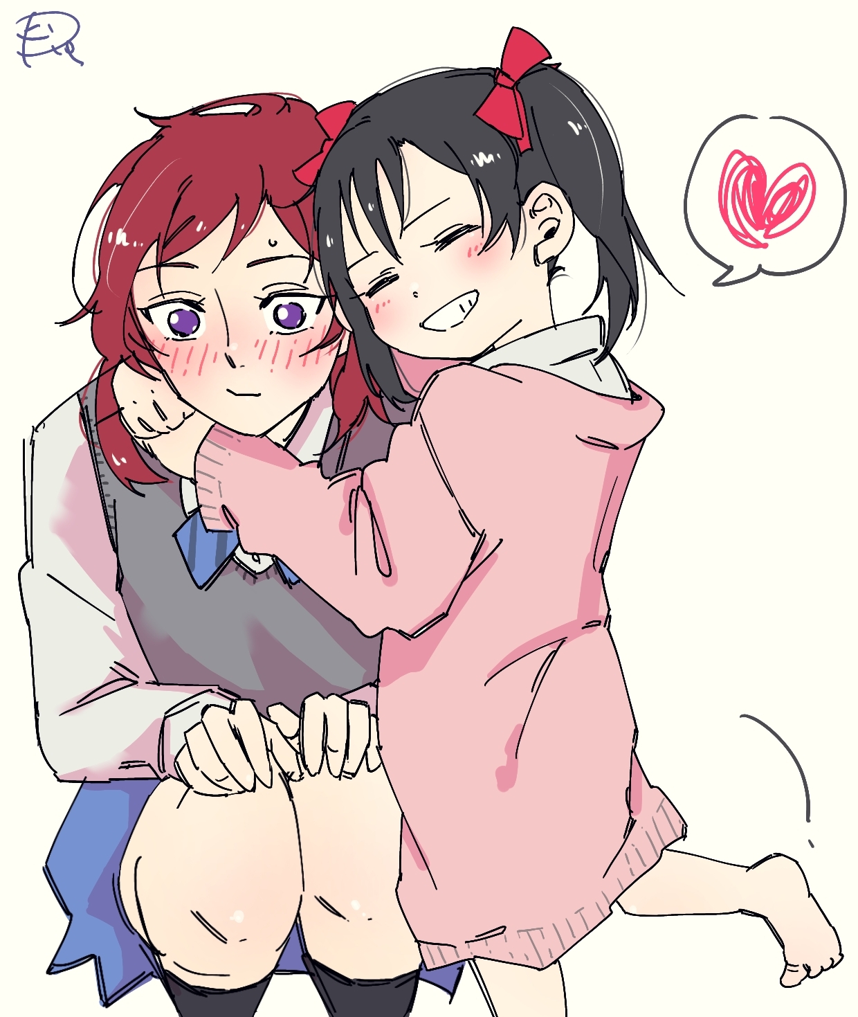 2girls aged_down barefoot black_hair blue_skirt blush bow child closed_eyes closed_mouth commentary_request grey_sweater_vest grin hair_bow heart highres love_live! love_live!_school_idol_project medium_hair multiple_girls nishikino_maki otonokizaka_school_uniform pink_sweater purple_eyes red_bow red_hair school_uniform shirt skirt smile spoken_heart squatting surfacedxxc sweater sweater_vest twintails white_shirt yazawa_nico