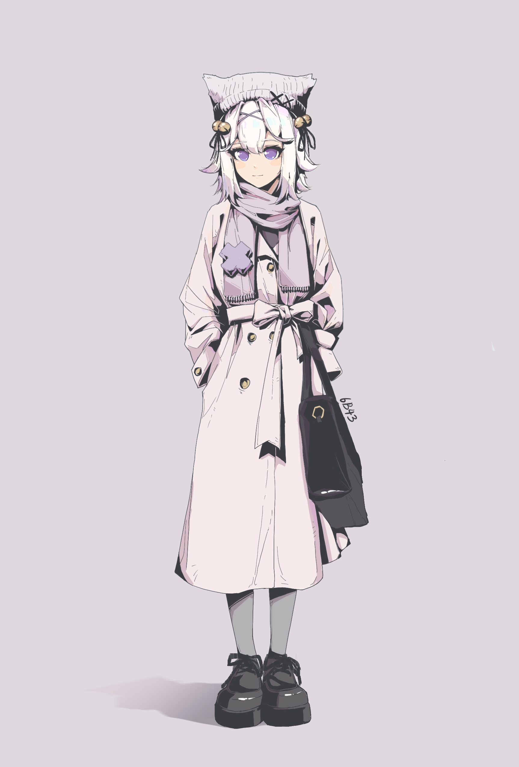 1girl 6b43 absurdres alternate_costume animal_ears artist_name bag bell black_bag black_ribbon black_shoes blush blush_stickers closed_mouth coat commentary english_commentary eyelashes filian_(vtuber) full_body grey_background grey_pantyhose hair_bell hair_ornament hair_ribbon handbag hands_in_pockets hat highres indie_virtual_youtuber long_hair pantyhose purple_eyes purple_scarf ribbon rindo_(vrchat) scarf shoelaces shoes simple_background solo standing virtual_youtuber white_coat white_hair white_hat winter_clothes