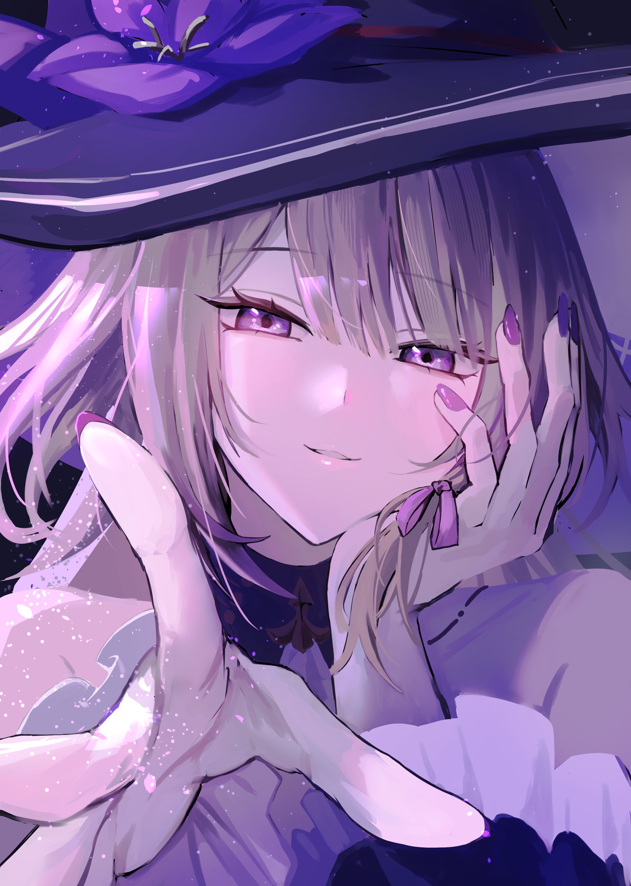 1girl absurdres ascot bare_shoulders brown_hair detached_collar detached_sleeves flower hair_ribbon hand_on_own_face hashtag-only_commentary hat herta_(honkai:_star_rail) highres honkai:_star_rail honkai_(series) long_hair looking_at_viewer neneneneko purple_eyes purple_flower purple_nails reaching ribbon sidelocks smile sparkle the_herta_(honkai:_star_rail) white_ascot