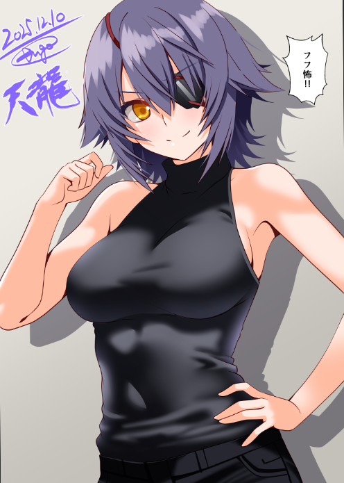 1girl alternate_costume black_pants black_shirt blush breasts character_name commentary_request cowboy_shot dated engo_(aquawatery) eyepatch gradient_background grey_background hand_on_own_hip kantai_collection large_breasts medium_breasts one-hour_drawing_challenge pants purple_hair shirt short_hair signature sleeveless sleeveless_shirt smile solo speech_bubble tenryuu_(kancolle) tenryuu_kai_ni_(kancolle) turtleneck turtleneck_shirt twitter_username upper_body yellow_eyes