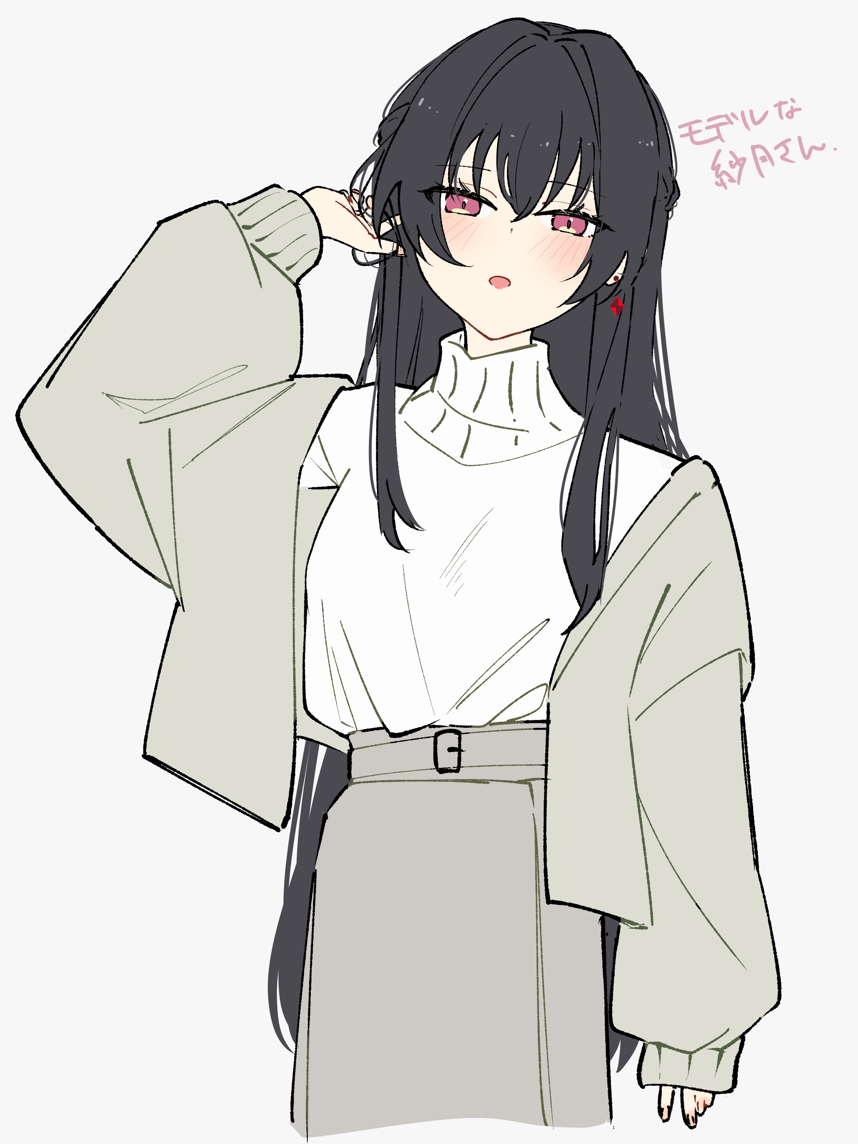 1girl absurdres black_hair blush cardigan commentary earrings green_cardigan grey_skirt hashtag-only_commentary highres jewelry koto_satsuki long_hair parted_lips purple_background red_eyes shinano1009 simple_background skirt solo sweater translation_request watashi_ga_koibito_ni_nareru_wake_naijan_murimuri! white_sweater