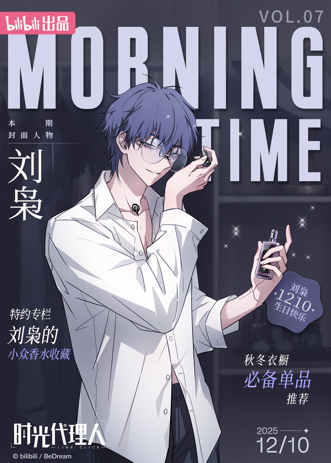 1boy birthday black_pants blue_hair character_name chinese_text closed_mouth collared_shirt commentary_request copyright_name cover cowboy_shot english_text fake_cover fake_magazine_cover glasses happy_birthday highres holding korean_text lighter liu_xiao long_sleeves looking_at_viewer magazine_cover male_focus mixed-language_text official_art pants partially_unbuttoned purple_hair round_eyewear sgdlr_offical shiguang_dailiren shirt short_hair smile solo sparkle standing tattoo white_shirt