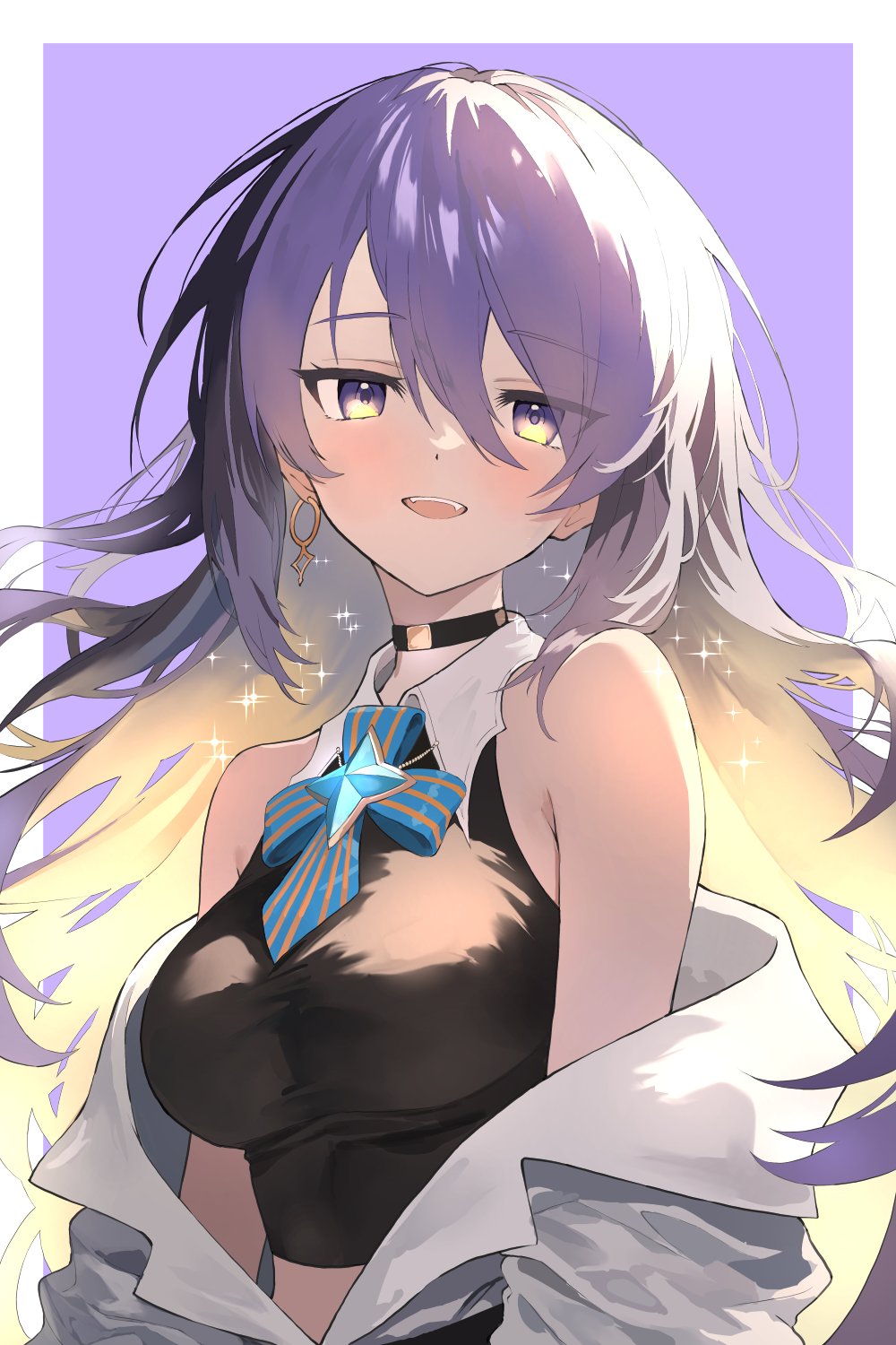 1girl black_choker black_shirt blonde_hair border breasts choker colored_inner_hair crop_top earrings gradient_hair grim_jisoo hair_between_eyes highres hololive hololive_indonesia jacket jewelry large_breasts long_hair looking_at_viewer moona_hoshinova moona_hoshinova_(1st_costume) multicolored_hair off_shoulder open_mouth purple_background purple_eyes purple_hair shirt single_earring sleeveless sleeveless_shirt solo sparkle teeth upper_teeth_only virtual_youtuber white_border white_jacket