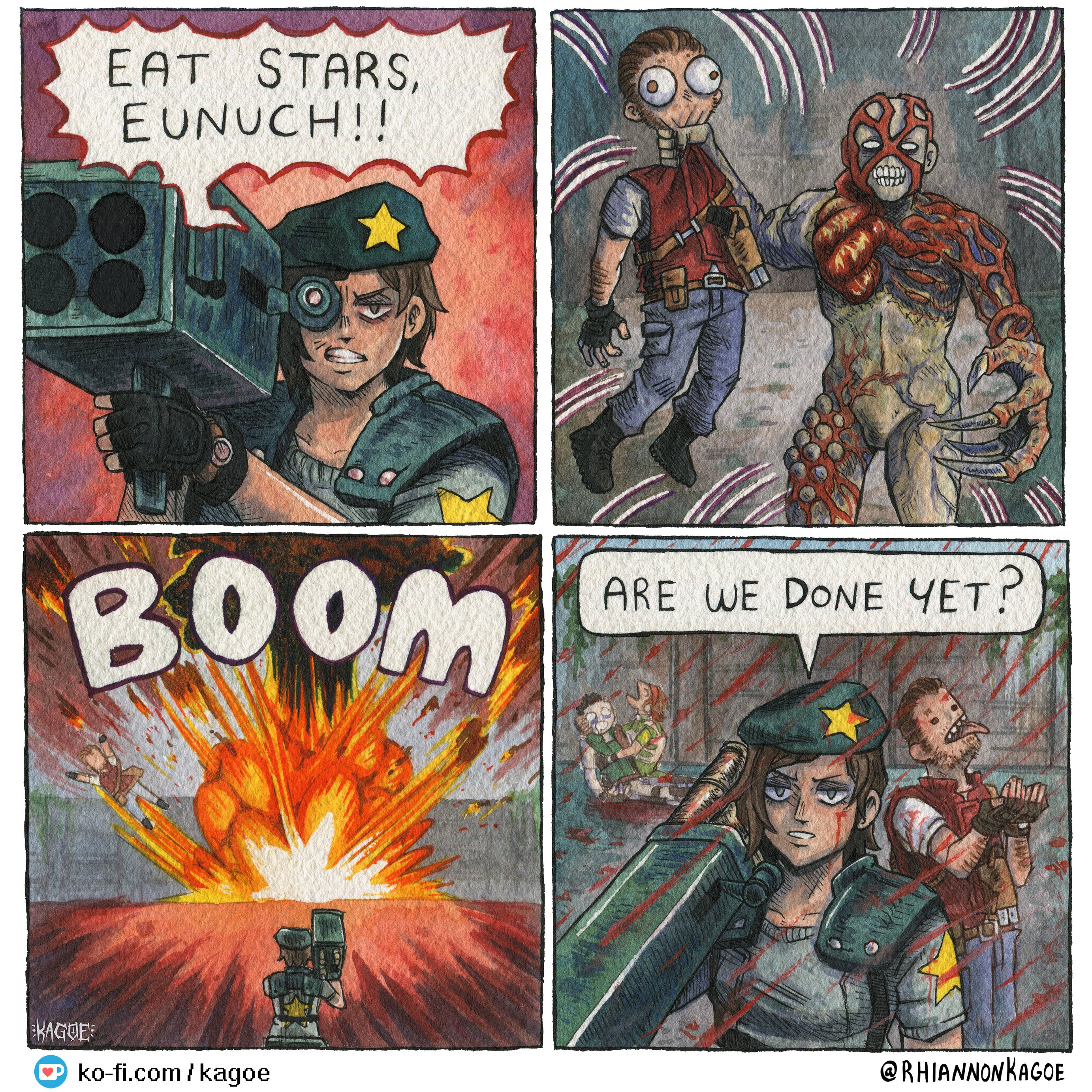 2boys 2girls absurdres artist_name barry_burton beard_stubble beret blue_hat blue_shirt brown_hair chris_redfield claws commentary english_commentary explosion facial_hair hat highres jill_valentine multiple_boys multiple_girls rebecca_chambers resident_evil resident_evil_1 rhiannon_kagoe rocket_launcher shirt shoulder_pads speech_bubble stubble tyrant_(resident_evil) tyrant_t-002 weapon