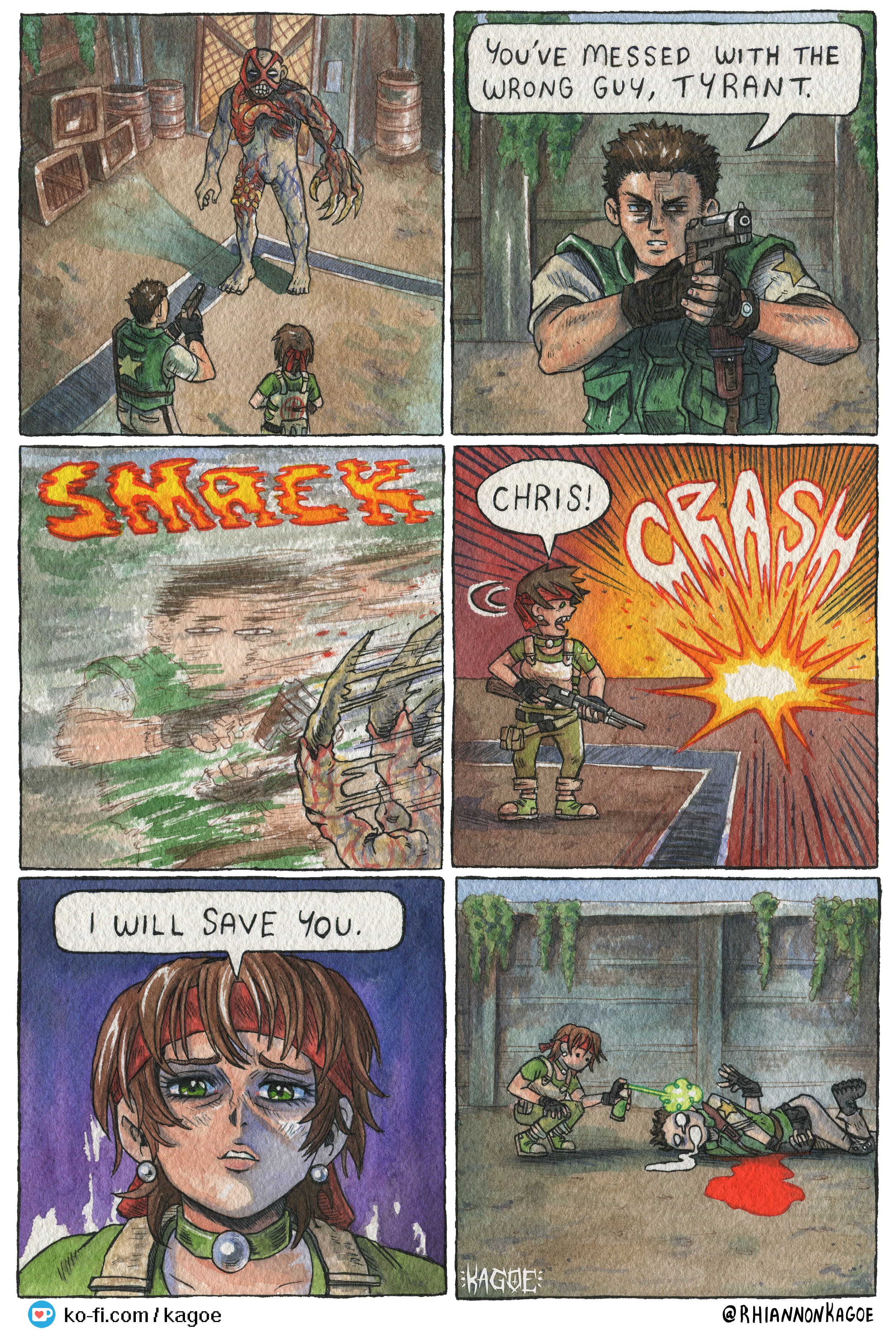 1boy 1girl absurdres artist_name bandana black_gloves blood brown_hair chris_redfield claws commentary earrings emphasis_lines english_commentary fingerless_gloves gloves gun handgun highres holding holding_gun holding_weapon jewelry rebecca_chambers red_bandana resident_evil resident_evil_1 rhiannon_kagoe speech_bubble tyrant_(resident_evil) tyrant_t-002 weapon