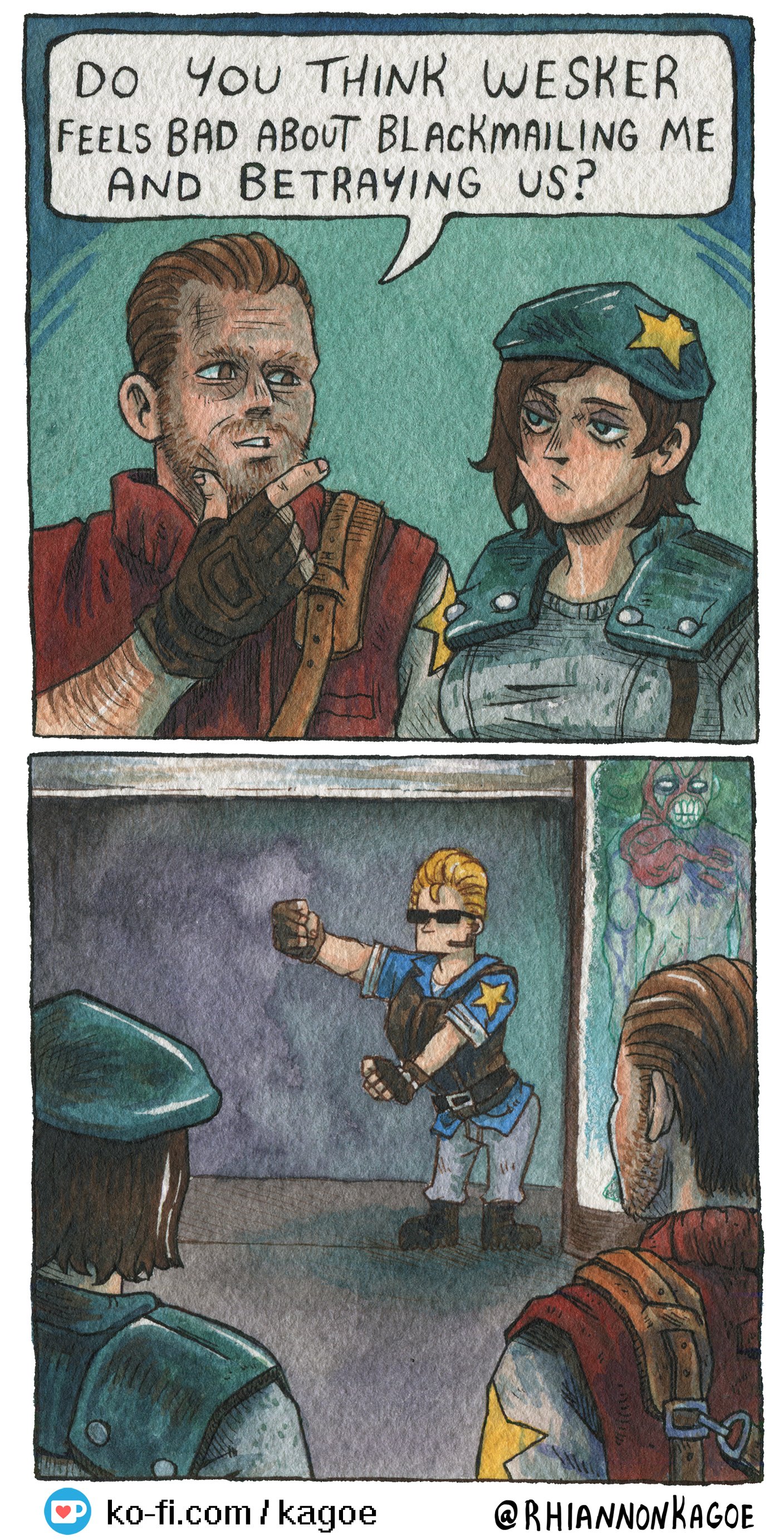 1girl 2boys absurdres albert_wesker artist_name barry_burton beard_stubble beret black_gloves blue_eyes blue_hat blue_shirt facial_hair fingerless_gloves gloves hat highres jill_valentine multiple_boys resident_evil resident_evil_1 rhiannon_kagoe shirt shoulder_pads stubble the_monkey_(dance) tyrant_(resident_evil) tyrant_t-002