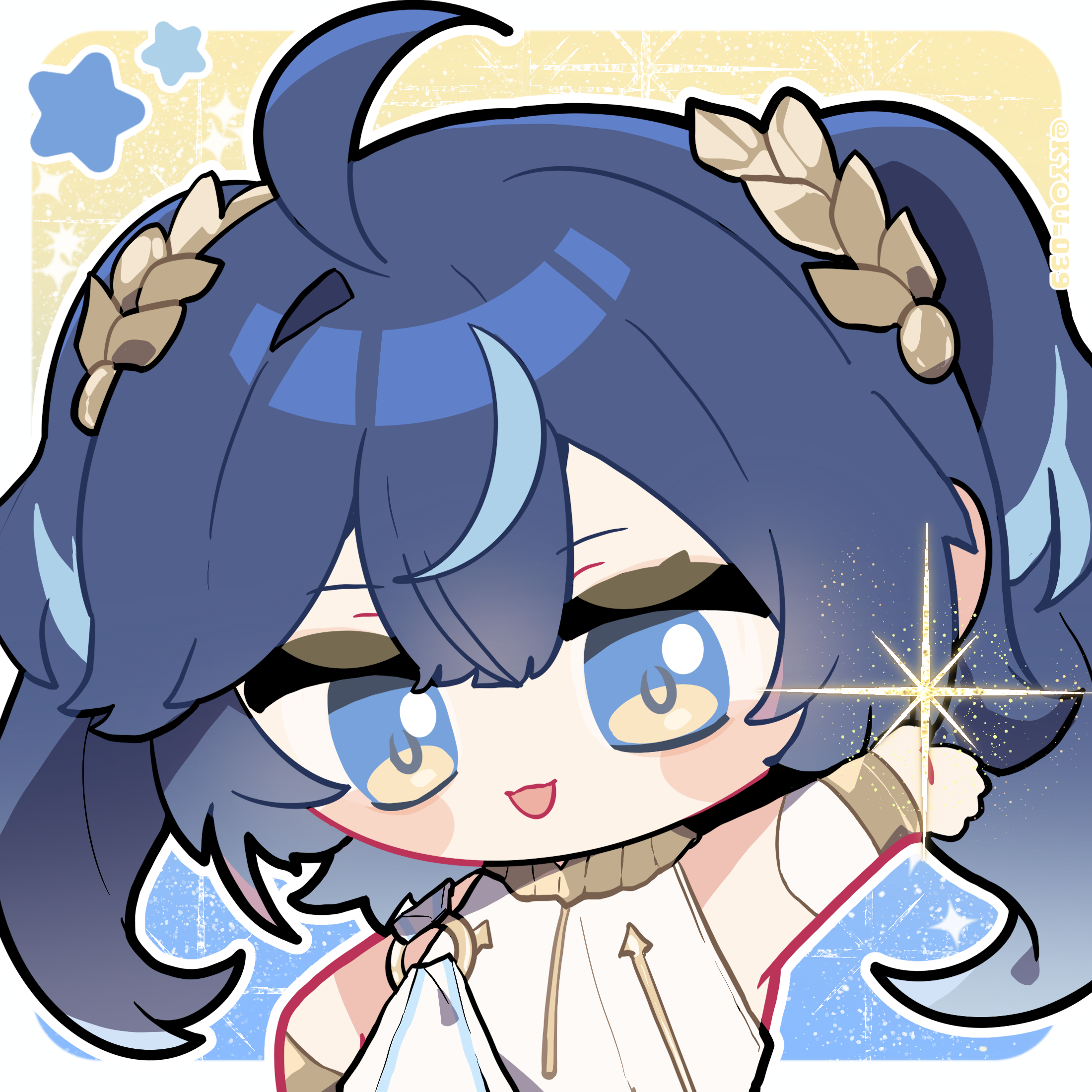 1girl aged_down ahoge arm_up blue_eyes blue_hair border bracelet chibi chibi_only chinese_commentary commentary_request highres iuno_(wuthering_waves) jewelry kyou_039 laurel_crown long_hair looking_at_viewer multicolored_hair open_mouth shirt smile solo streaked_hair twintails twitter_username upper_body white_border white_shirt wuthering_waves yellow_background