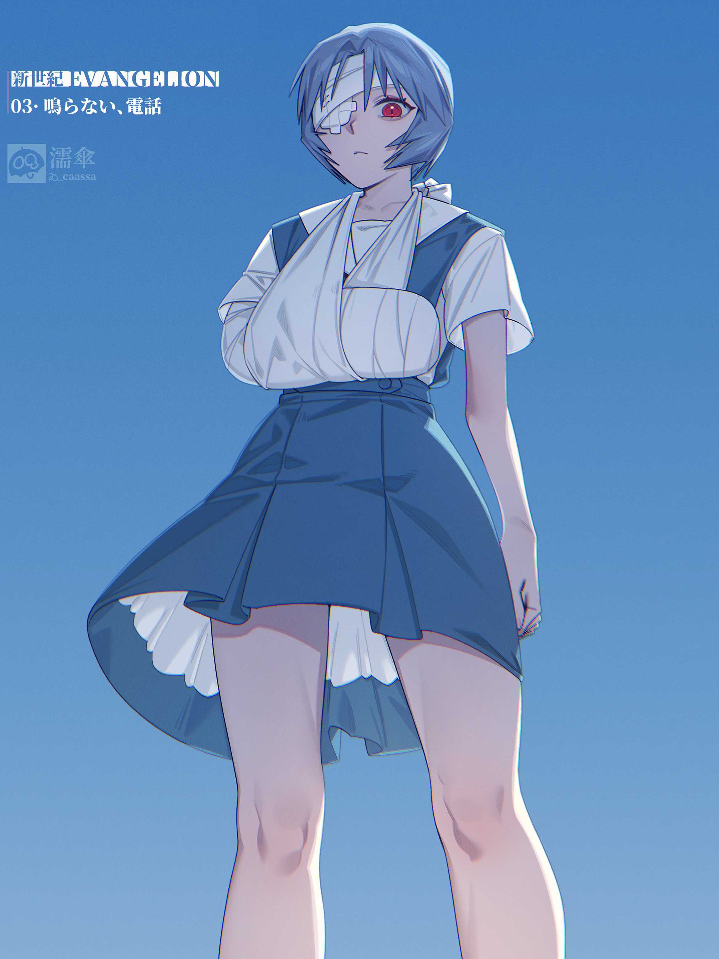 1girl absurdres artist_name ayanami_rei bandage_over_one_eye bandaged_arm bandaged_hand bandaged_head bandages blue_hair blue_skirt blue_sky blue_theme closed_mouth collared_shirt commentary copyright_name eyepatch from_below highres looking_at_viewer medical_eyepatch neon_genesis_evangelion nureta_kasa pleated_skirt red_eyes school_uniform shirt short_hair short_sleeves simple_background skirt sky solo thighs tokyo-3_middle_school_uniform white_shirt wind wind_lift