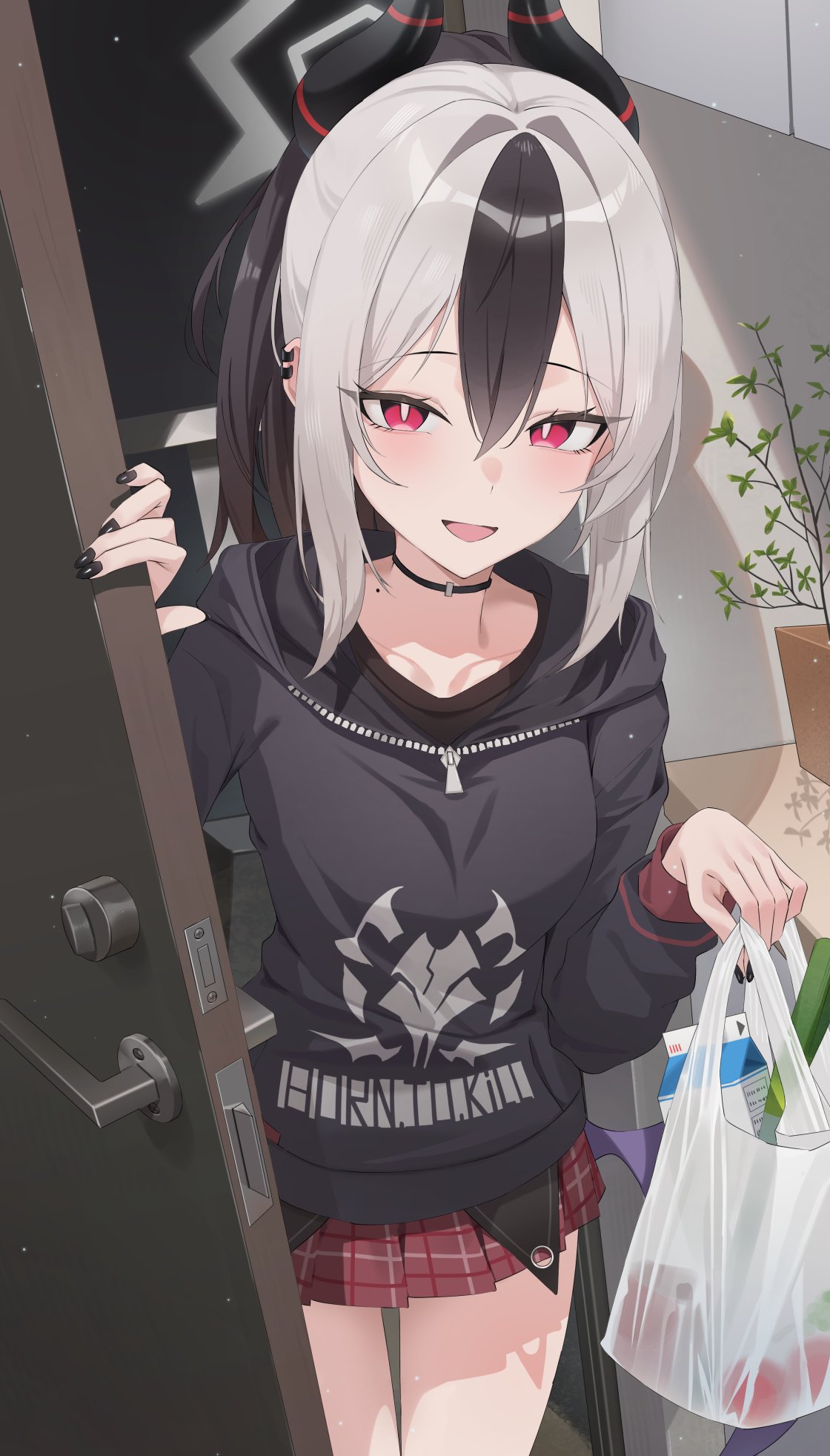 bag black_choker black_hair black_hoodie black_horns black_nails blue_archive bright_pupils choker collarbone commentary_request demon_horns demon_wings door ear_piercing earclip grey_halo grocery_bag halo highres holding holding_bag hood hoodie horns kayoko_(blue_archive) looking_at_viewer mole mole_on_collarbone multicolored_hair open_mouth opening_door piercing pleated_skirt ran_(gcrm8377) red_eyes red_skirt shopping_bag single_wing skirt smile two-tone_hair white_hair white_pupils wings