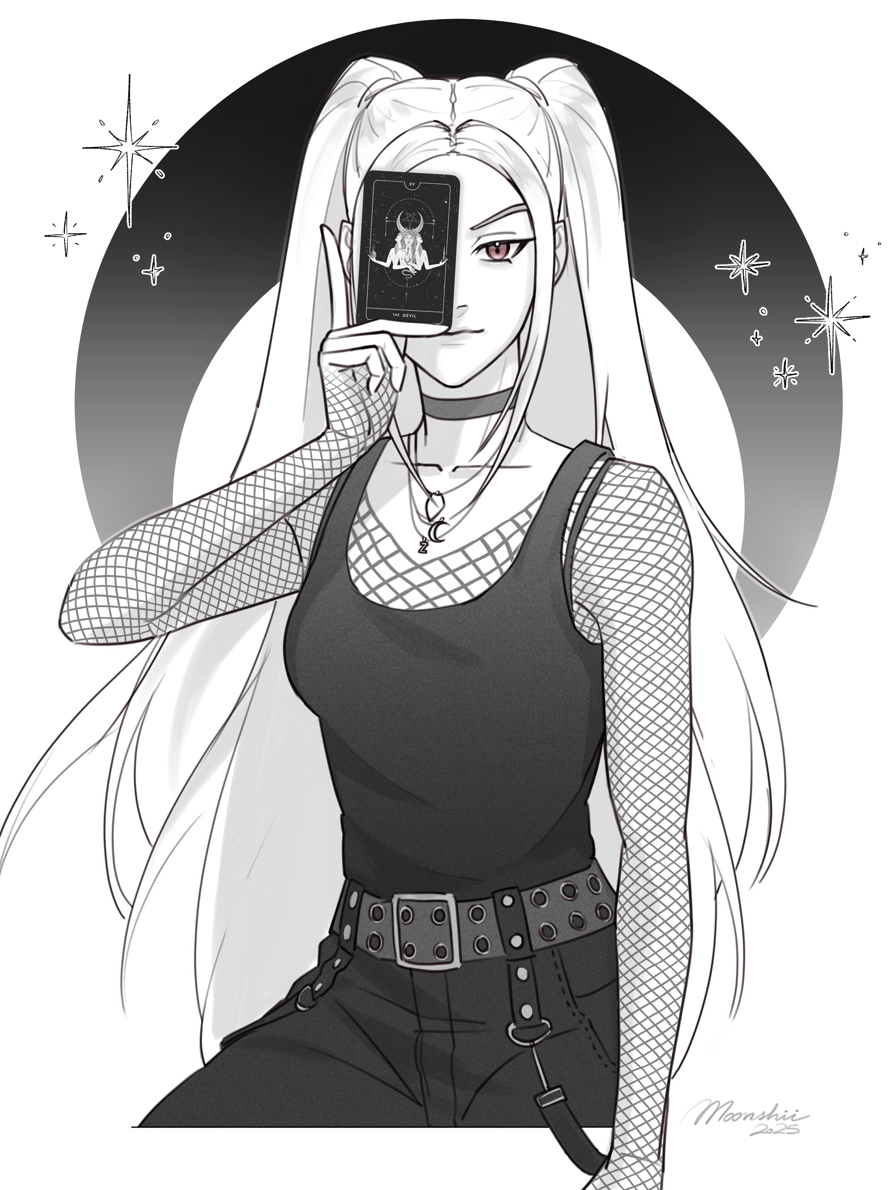 1girl absurdres card choker closed_mouth commentary english_commentary fishnet_top fishnets fruityycupcake greyscale highres holding holding_card jewelry kpop_demon_hunters long_hair mira_(kpop_demon_hunters) monochrome necklace pink_eyes sash sidelocks signature solo spot_color tank_top twintails