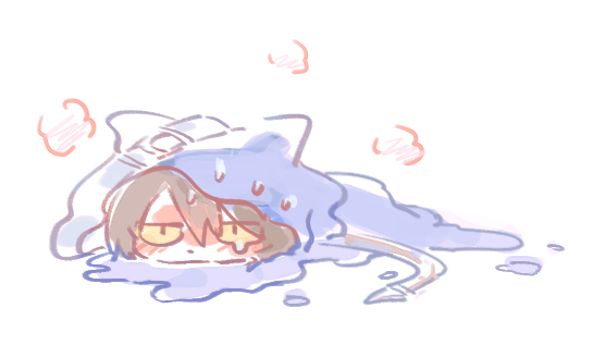 1boy arknights brown_eyes brown_hair chibi closed_mouth eyes_visible_through_hair hair_between_eyes looking_at_viewer male_focus melting myluche phantom_(arknights) puddle simple_background solo tragodia_(arknights) water white_background