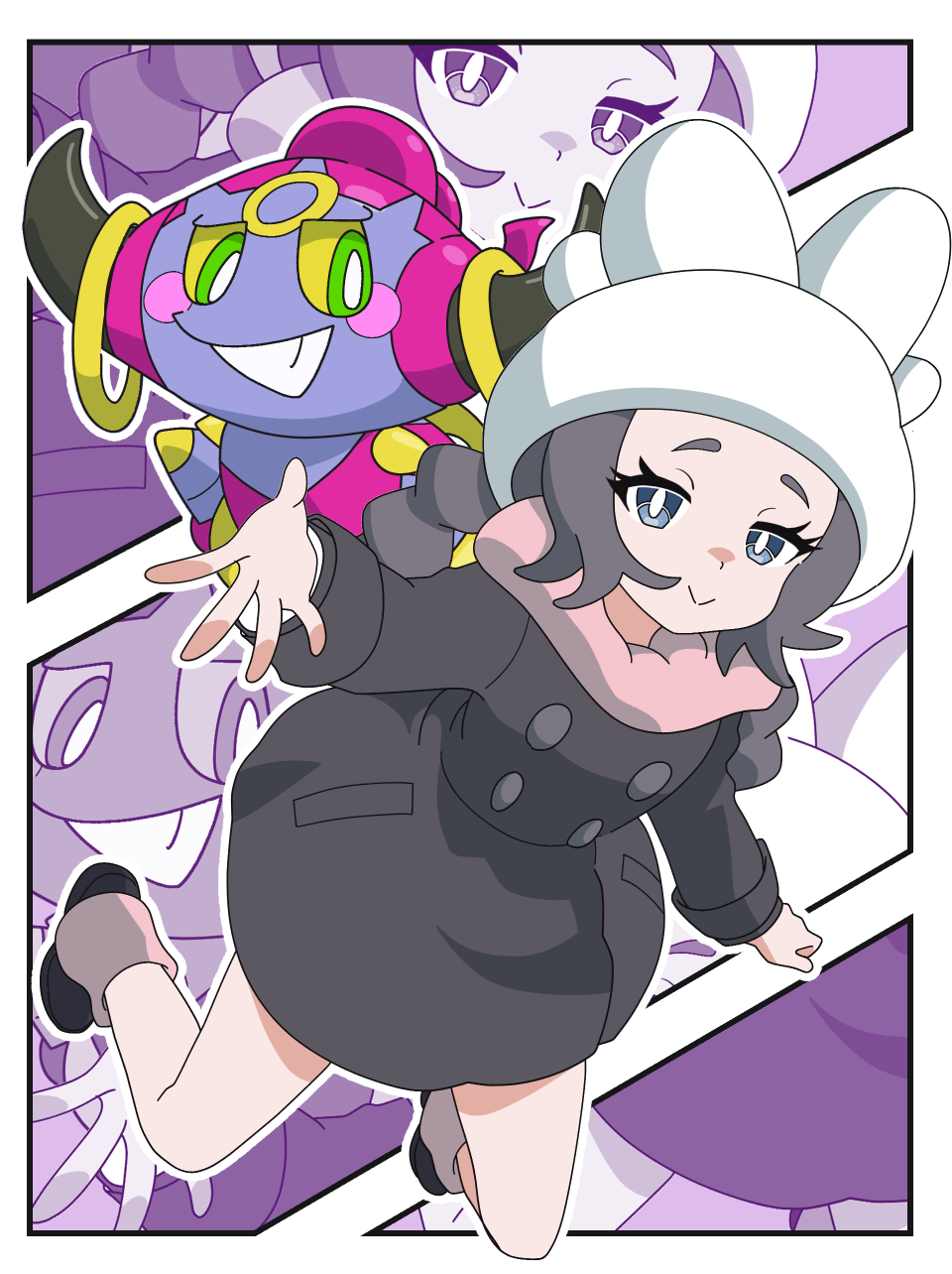 1girl ansha_(pokemon) black_coat black_hair blue_eyes closed_mouth coat colored_sclera eyelashes gen_6_pokemon green_eyes grin hat highres hoopa hoopa_(confined) horns kanbei_(pixiv11037490) legendary_pokemon long_hair long_sleeves looking_at_viewer mythical_pokemon nintendo open_mouth pink_scarf pokemon pokemon_(creature) pokemon_legends:_z-a scarf smile teeth white_hat winter_clothes winter_coat yellow_sclera zoom_layer