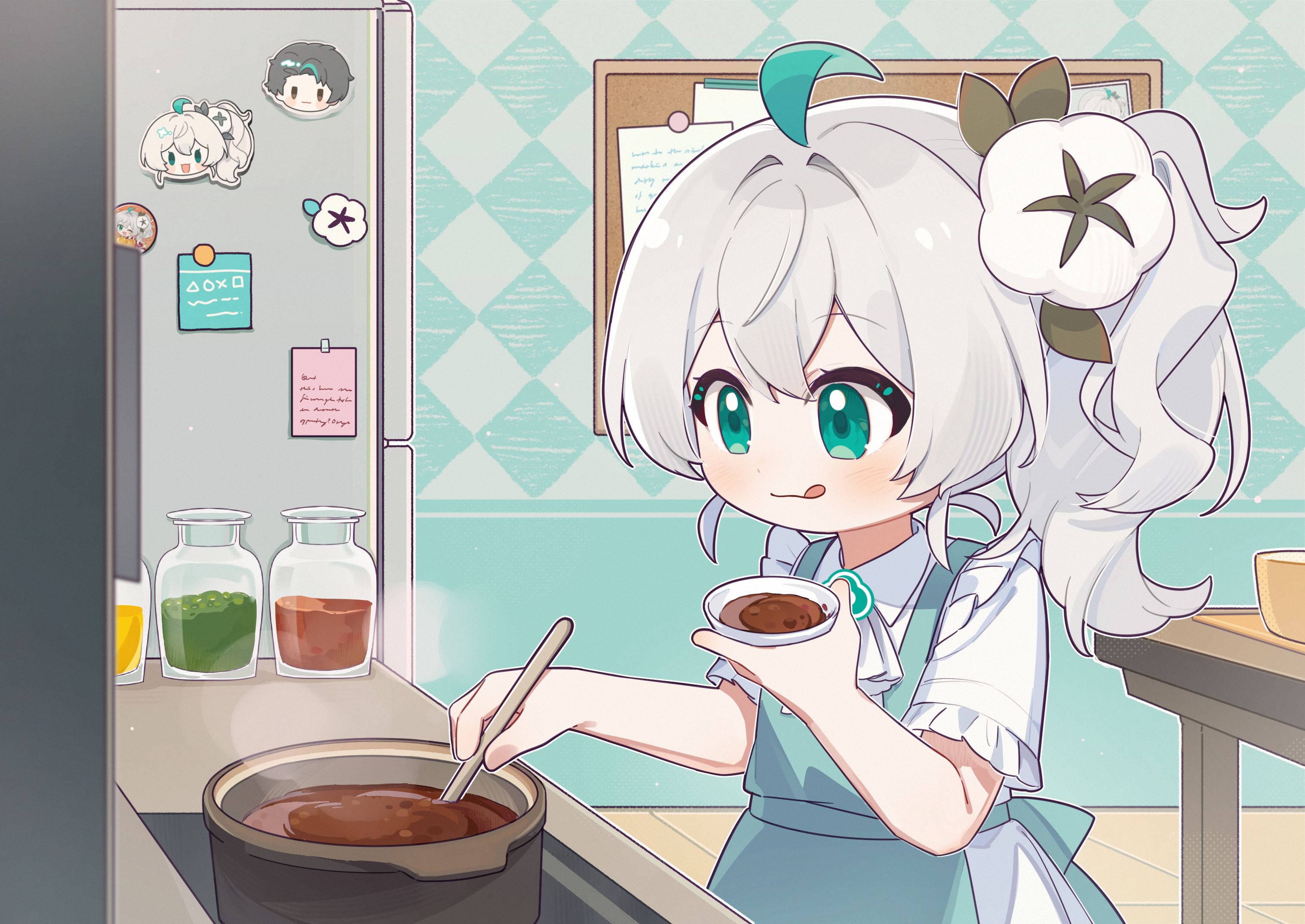 1girl :q ahoge alternate_costume apron blue_apron bowl closed_mouth commentary_request cooking food green_apron green_eyes green_hair hair_between_eyes hair_ornament highres holding indoors kitchen long_hair quanmian_shidai refrigerator short_sleeves side_ponytail smile solo table tongue tongue_out wen_xiaomian wenxiaomian_family white_hair