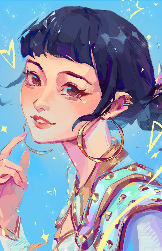 1girl black_hair blue_background brown_eyes commentary double_bun earrings english_commentary eyeliner hair_bun heart hoop_earrings jeunny jewelry kpop_demon_hunters long_sleeves makeup mascara pink_nails profile purple_nails short_bangs sidelocks simple_background smile solo sparkle zoey_(kpop_demon_hunters)