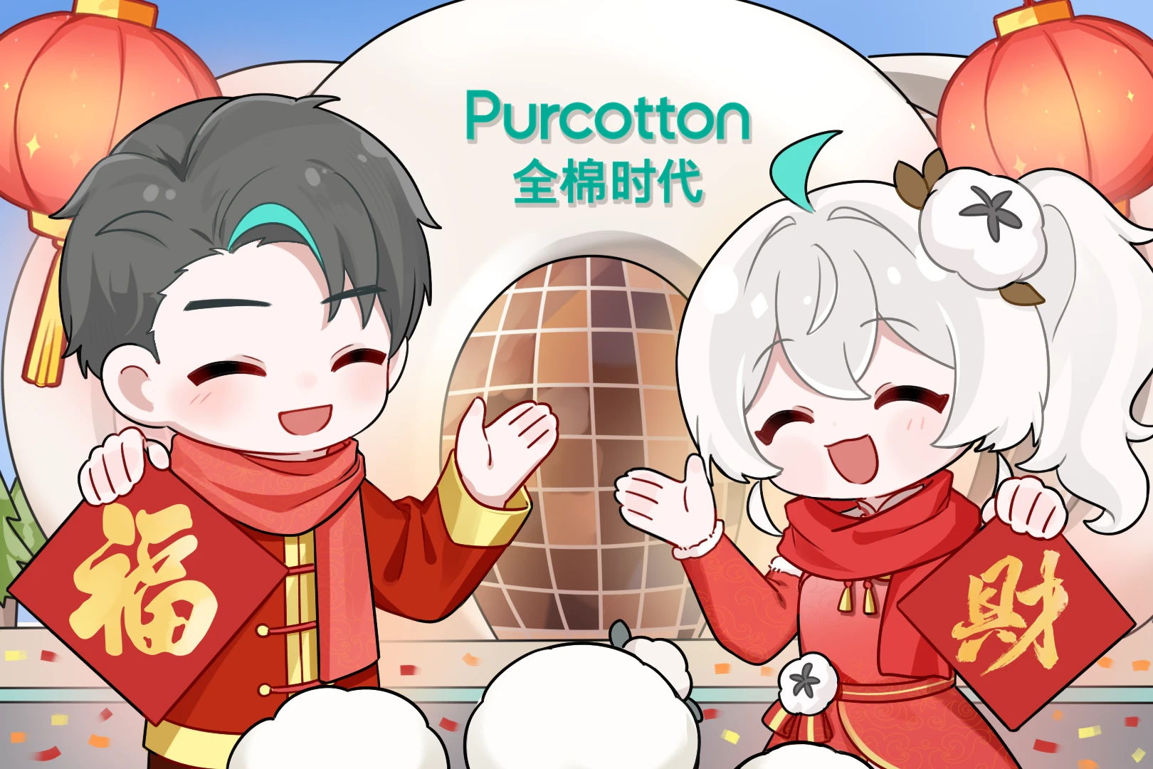 1boy 1girl ^_^ ahoge alternate_costume black_hair chibi chinese_clothes chinese_new_year chinese_text closed_eyes commentary_request dress english_text green_hair highres holding lantern mixed-language_text multicolored_hair open_mouth quanmian_shidai scarf side_ponytail smile streaked_hair wen_xiaomian wenxiaomian_family white_hair