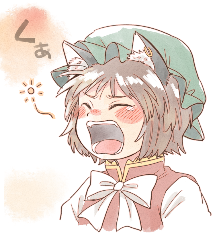 1girl animal_ear_fluff animal_ears blush brown_hair cat_ears cat_girl chen commentary_request hat hijiki_(hijiri_st) open_mouth red_vest shirt short_hair solo tearing_up teeth touhou upper_body vest white_shirt yawning