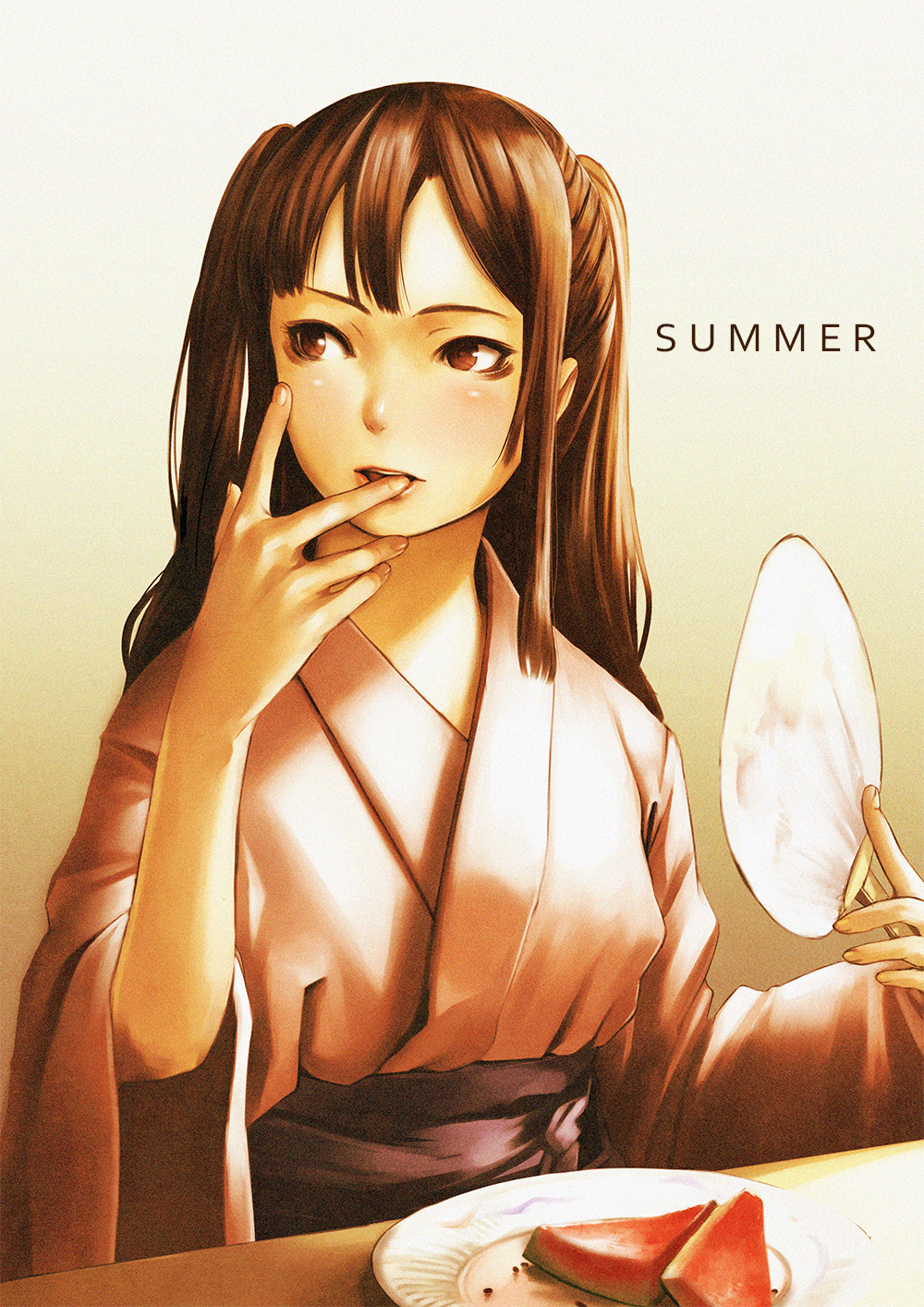 1girl brown_eyes brown_hair commentary_request food fruit hand_fan highres hotateyuki japanese_clothes kimono licking licking_finger looking_to_the_side original solo summer upper_body watermelon