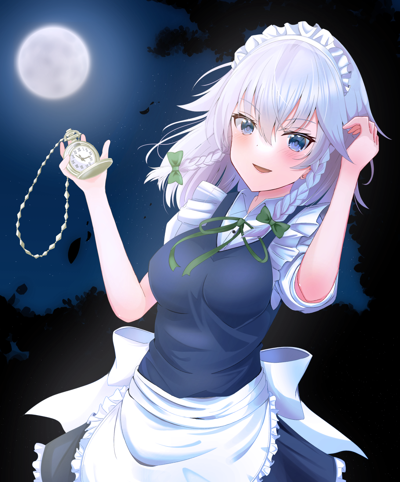 1girl apron back_bow blue_eyes blush bow braid breasts collared_shirt commentary_request full_moon green_bow green_ribbon grey_hair hair_bow highres holding holding_pocket_watch izayoi_sakuya long_hair looking_at_viewer maid maid_headdress moon neck_ribbon night open_mouth outdoors pocket_watch ribbon ringo002 shirt sky smile solo touhou twin_braids waist_apron watch white_apron white_bow white_shirt