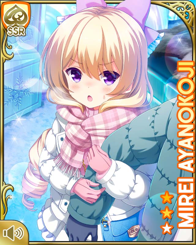 1boy 1girl :o ayanokoji_mirei black_legwear blonde_hair blouse bow card character_name curly_hair female_focus girlfriend_(kari) gloves hair_ornament indoors jacket long_hair official_art open_mouth ouju pink_bow pink_scarf plaid_clothes plaid_scarf purple_eyes qp:flapper ringlets scarf shirt shoes skirt snow solo standing sweden tagme very_long_hair white_jacket white_shirt white_skirt winter_clothes