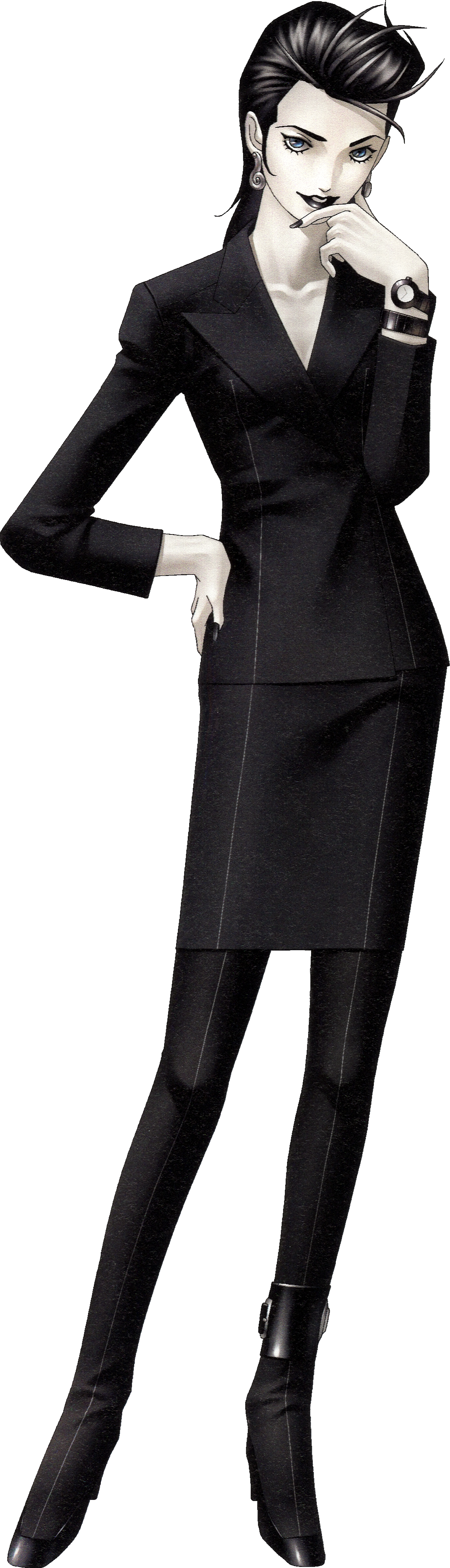 1girl absurdres black_hair black_nails black_shoes earrings full_body hand_on_own_face hand_on_own_hip high_heels highres jewelry kazuma_kaneko lilith_(megami_tensei) nail_polish official_art photoshop_(medium) pompadour raised_eyebrow shin_megami_tensei shin_megami_tensei_i shoes solo third-party_source transparent_background uneven_eyes watch wristwatch yuriko_(megami_tensei)