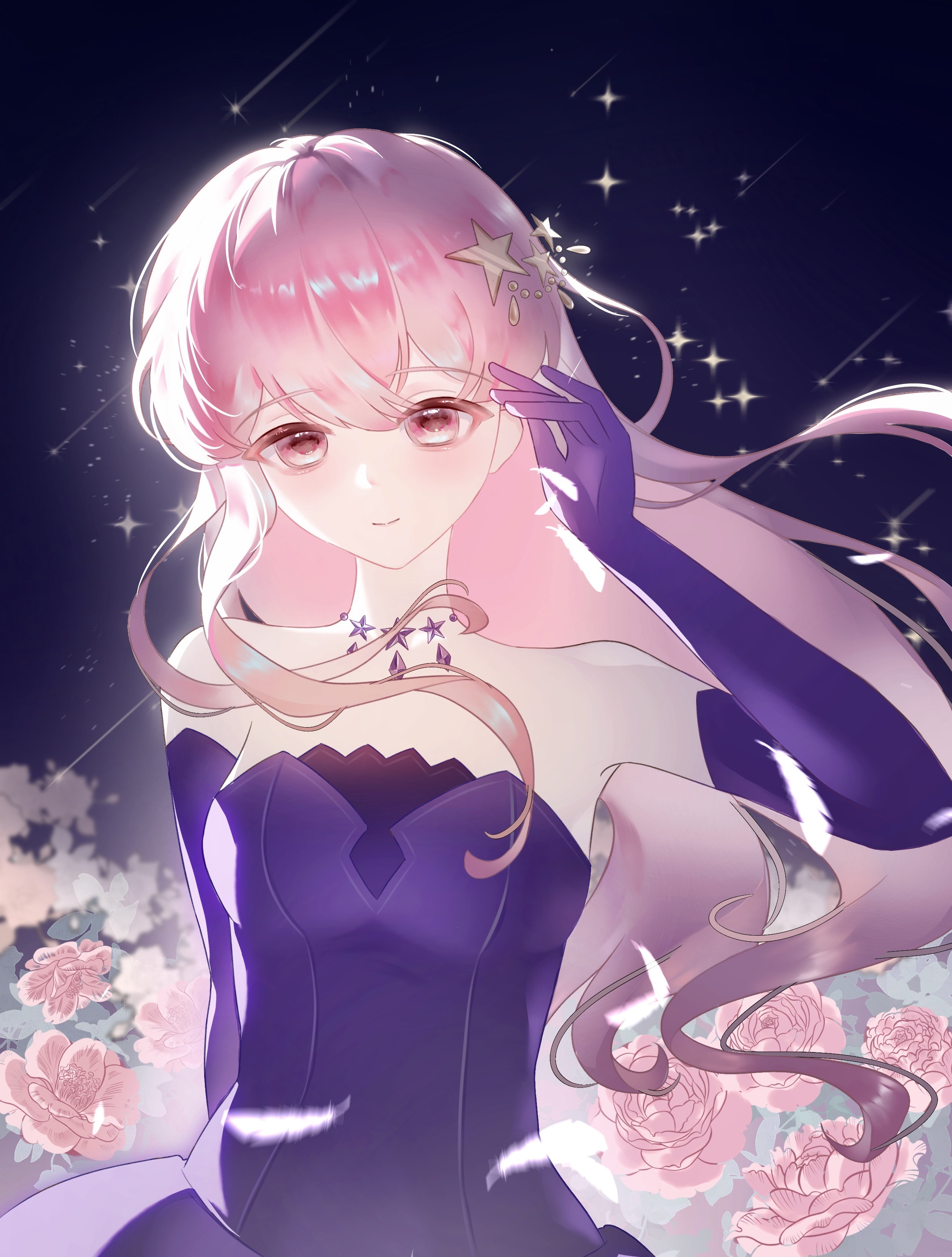 1girl absurdres adjusting_hair bare_shoulders beads brown_eyes chinese_commentary closed_mouth commentary_request cowboy_shot crossed_bangs dot_nose dress elbow_gloves feathers field floating_hair flower flower_field gloves hair_beads hair_between_eyes hair_ornament hand_in_own_hair happy hebo_(xinjinjumin299393807253) highres infinity_nikki jewelry light_blush light_particles long_sidelocks looking_at_viewer loose_hair_strand necklace night nikki_(nikki) nikki_(series) outdoors pink_flower pink_rose purple_dress purple_gloves rose shooting_star sidelocks sky smile solo sparkle star_(sky) star_(symbol) star_hair_ornament star_necklace star_sea_(nikki) starry_sky strapless strapless_dress wavy_hair wind