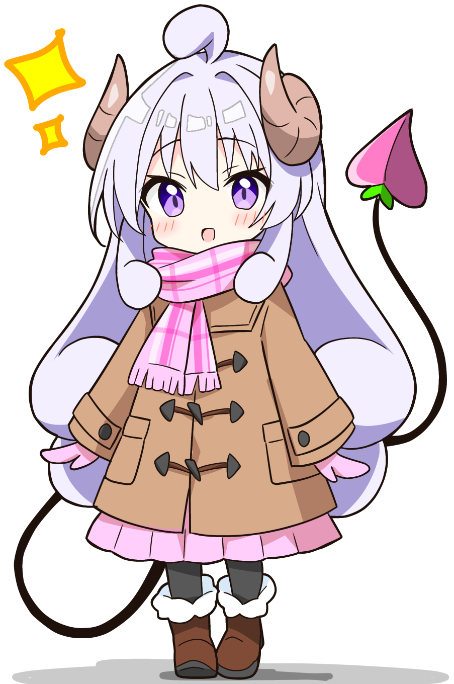 1girl :d ahoge black_pantyhose blush boots brown_boots brown_coat coat commentary_request curly_hair demon_girl demon_horns demon_tail full_body fur-trimmed_boots fur_trim highres horns kotatsu-mazoku lilith_(homunculus)_(machikado_mazoku) lilith_(machikado_mazoku) long_hair long_sleeves looking_at_viewer machikado_mazoku mittens open_mouth pantyhose pink_mittens pink_scarf pink_skirt plaid_clothes plaid_scarf pleated_skirt purple_eyes purple_hair scarf sidelocks simple_background skirt smile solo sparkle standing tail white_background