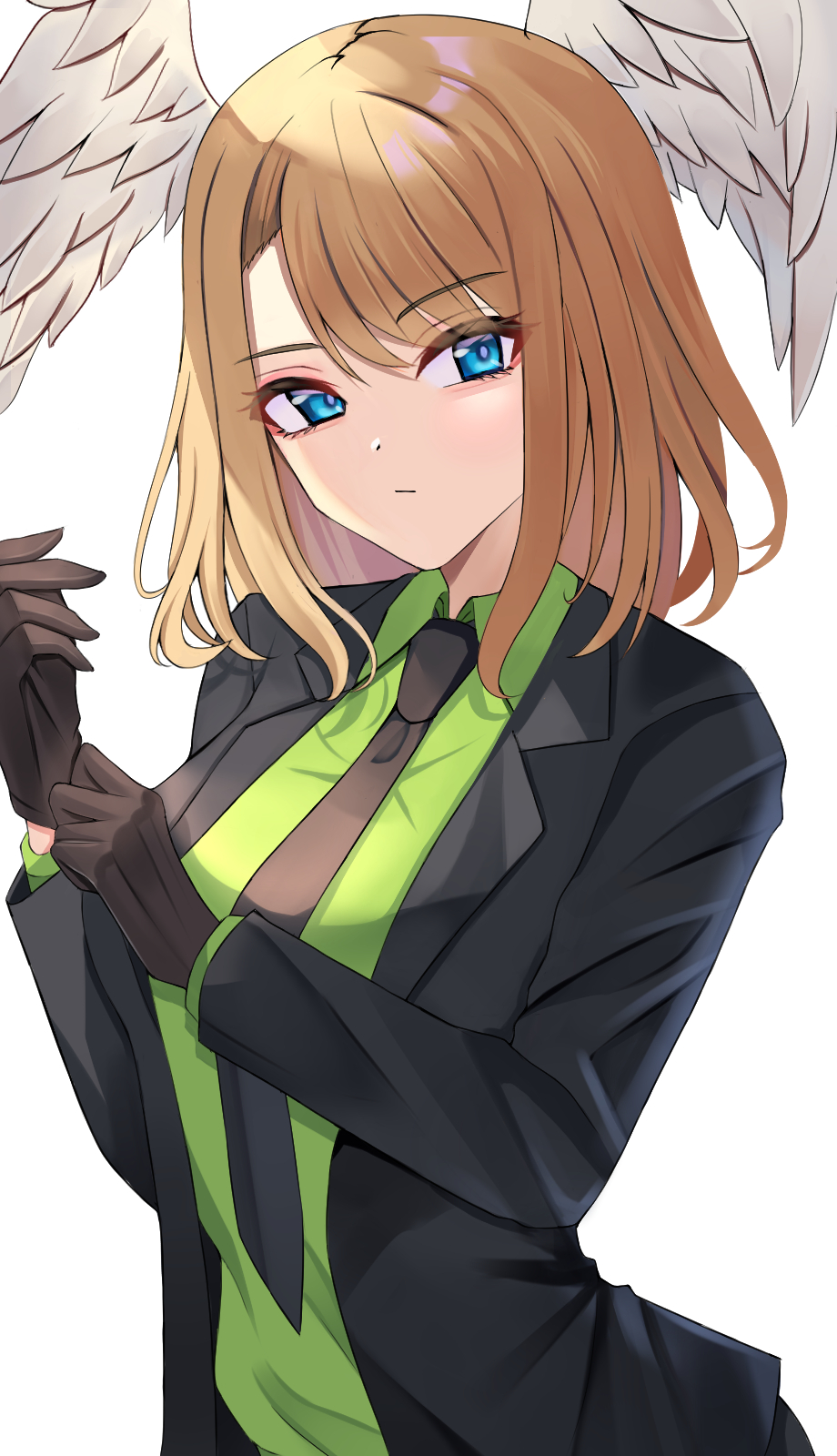 1girl adjusting_clothes adjusting_gloves alternate_costume black_jacket black_necktie blue_eyes breasts brown_hair commentary_request eunie_(xenoblade) gloves green_shirt head_wings highres jacket kyaro_(wanu_14) necktie shirt short_hair simple_background solo upper_body white_background white_wings wings xenoblade_chronicles_(series) xenoblade_chronicles_3