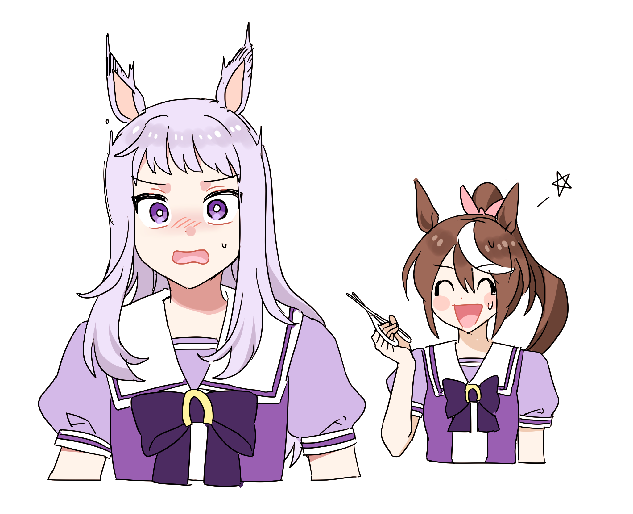 2girls :d ^_^ alternate_hairstyle animal_ears bow bowtie brown_hair closed_eyes commentary_request cropped_shoulders cutting_hair habsida_(habsida_hpy) hair_between_eyes hair_bow highres holding holding_scissors horse_ears horse_girl long_hair mejiro_mcqueen_(umamusume) multicolored_hair multiple_girls open_mouth pentagram pink_bow ponytail puffy_short_sleeves puffy_sleeves purple_bow purple_bowtie purple_eyes purple_hair purple_shirt sailor_collar sailor_shirt school_uniform scissors shirt short_bangs short_sleeves simple_background smile streaked_hair surprised tokai_teio_(umamusume) tracen_school_uniform two-tone_hair umamusume white_background white_hair white_sailor_collar