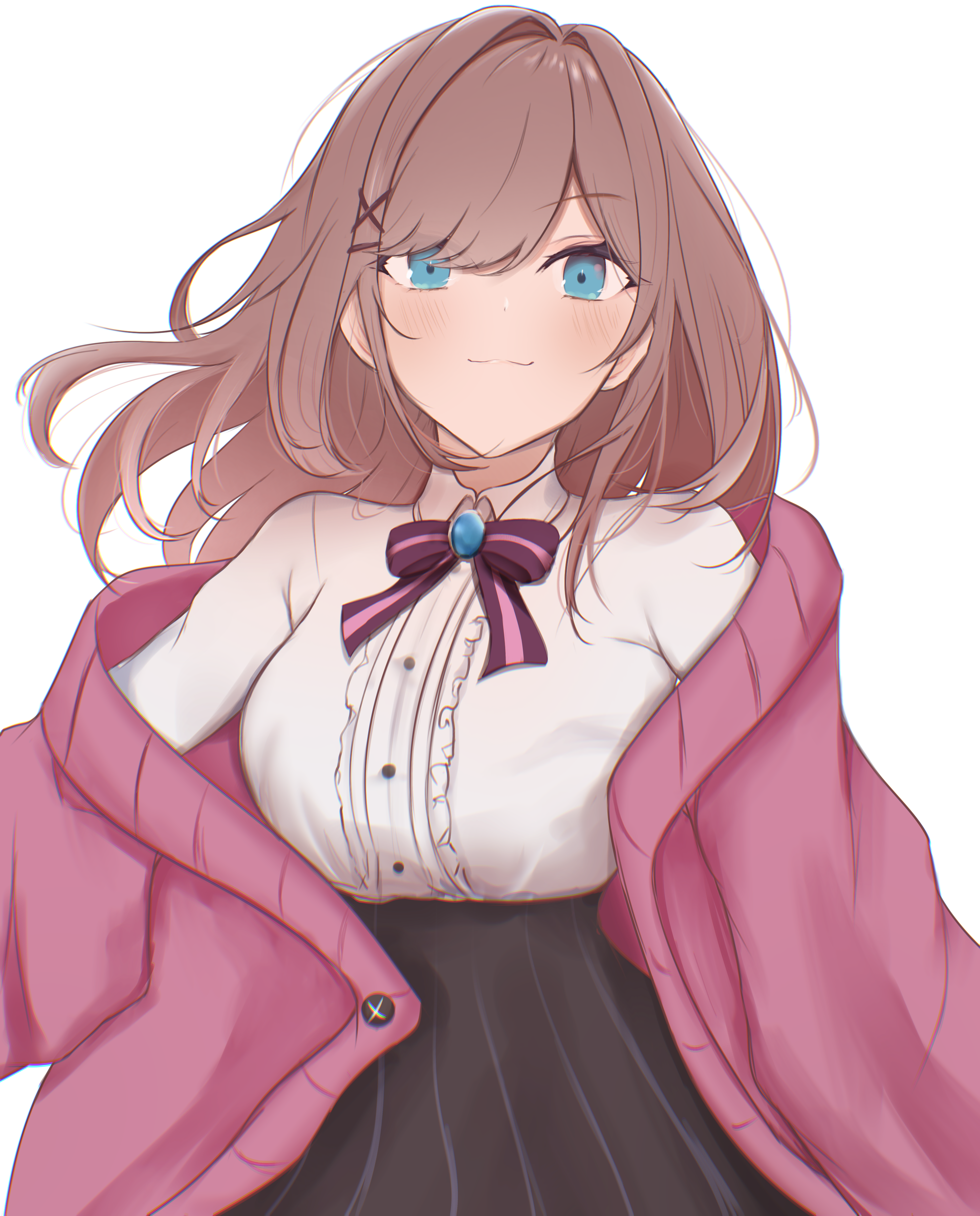1girl absurdres black_skirt blue_gem breasts brown_hair cardigan center_frills closed_mouth collared_shirt commentary frilled_shirt frills gem green_eyes hair_intakes hair_ornament hairclip highres large_breasts long_hair long_sleeves nijisanji open_cardigan open_clothes pink_cardigan pink_ribbon ri_shan ribbon shirt simple_background skirt smile solo striped_ribbon suzuhara_lulu suzuhara_lulu_(1st_costume) two-tone_ribbon virtual_youtuber white_background white_shirt