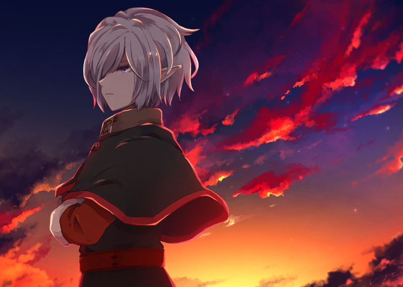 1boy closed_mouth cloud kotori_(lycka) looking_at_viewer lucifer_(star_ocean) male_focus pointy_ears robe short_hair solo star_ocean star_ocean:_the_second_story white_hair