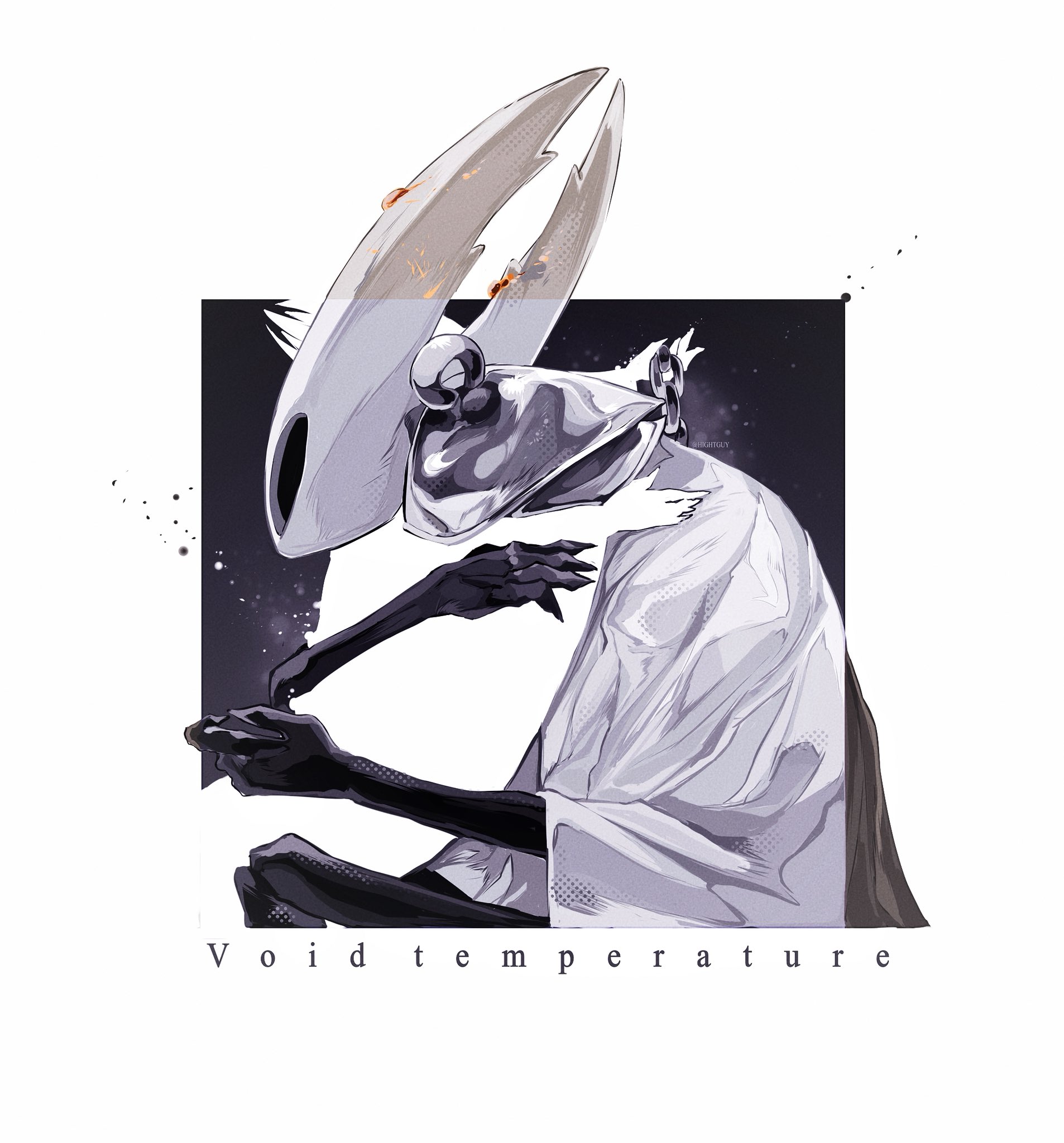 1boy 1other armor artist_name ben-day_dots black_cloak chain cloak commentary crack english_commentary english_text father_and_child highres hightguy hollow_eyes hollow_knight hollow_knight_(character) horns hug pale_king_(hollow_knight) parent_and_child pauldrons pure_vessel screentones shoulder_armor white_cloak