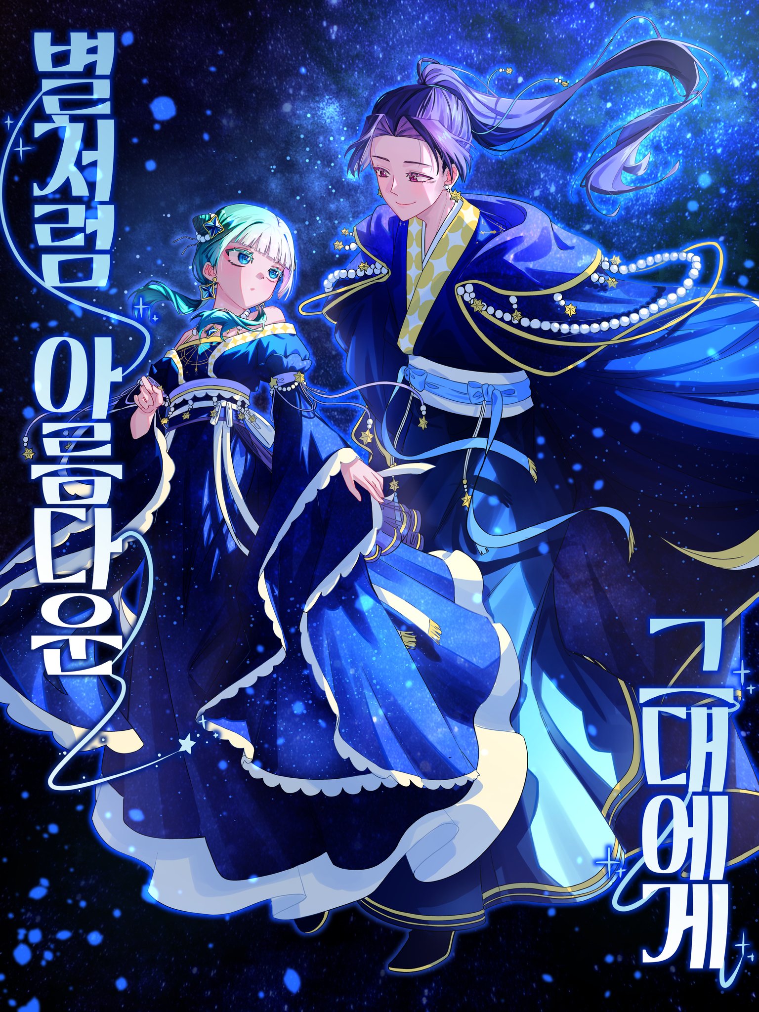 1boy 1girl blue_eyes closed_mouth colored_eyelashes double_bun dress earrings frilled_dress frills green_dress green_eyes green_hair hair_bun head_tilt highres jewelry jinshi_(kusuriya_no_hitorigoto) korean_text kusuriya_no_hitorigoto long_hair looking_at_another maomao_(kusuriya_no_hitorigoto) necklace nyangnyang19770 parted_bangs ponytail purple_eyes purple_hair space twintails