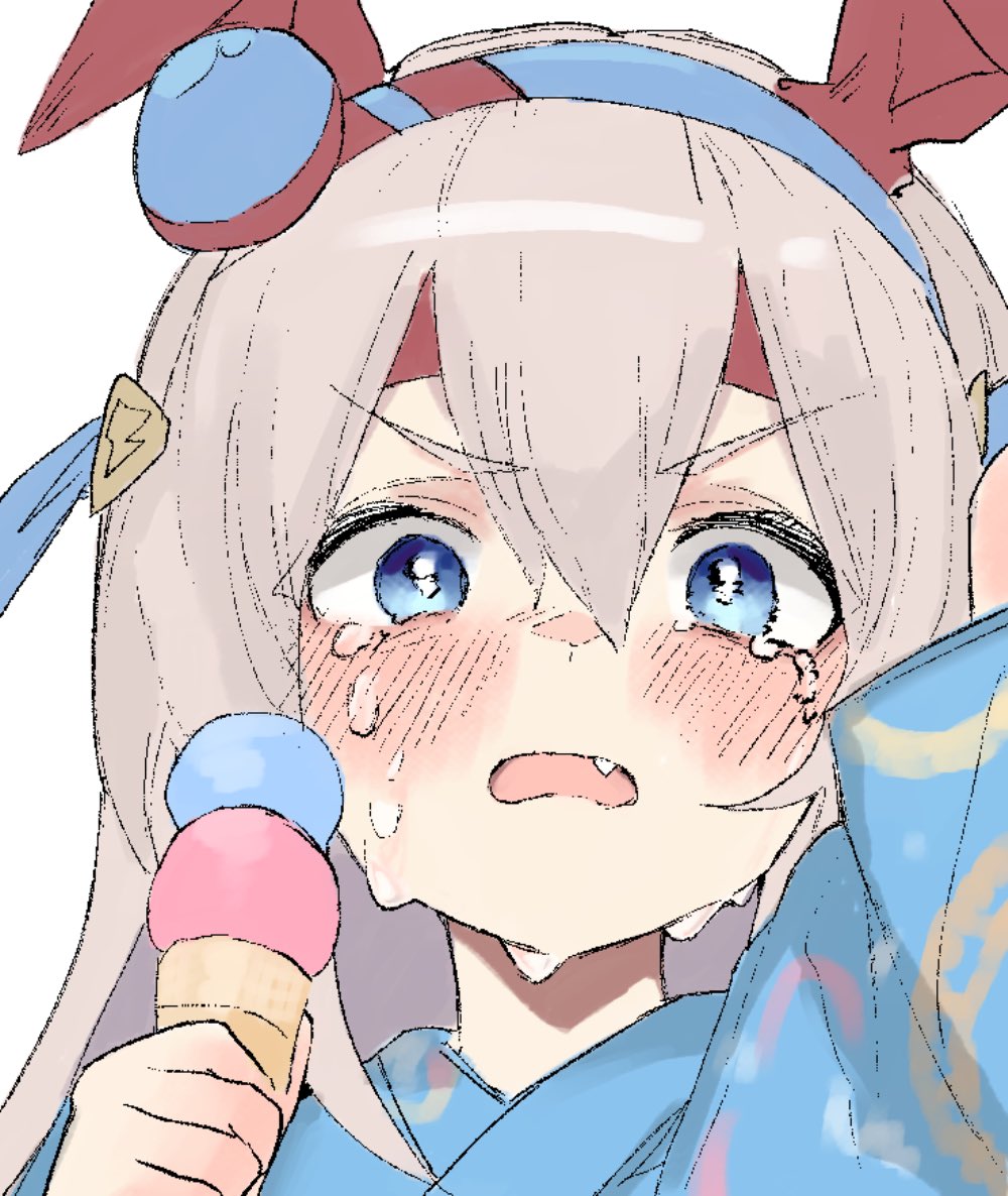 1girl animal_ears blue_eyes blue_hairband blush commentary_request crying ear_covers ear_ornament fang food grey_hair hair_between_eyes hairband headband horse_ears horse_girl ice_cream japanese_clothes kaiwan_(kaiwan_zhang) kimono long_hair long_sleeves multicolored_hairband open_mouth red_headband shirt solo striped_clothes striped_hairband tamamo_cross_(umamusume) tears two-tone_hairband umamusume very_long_hair yukata