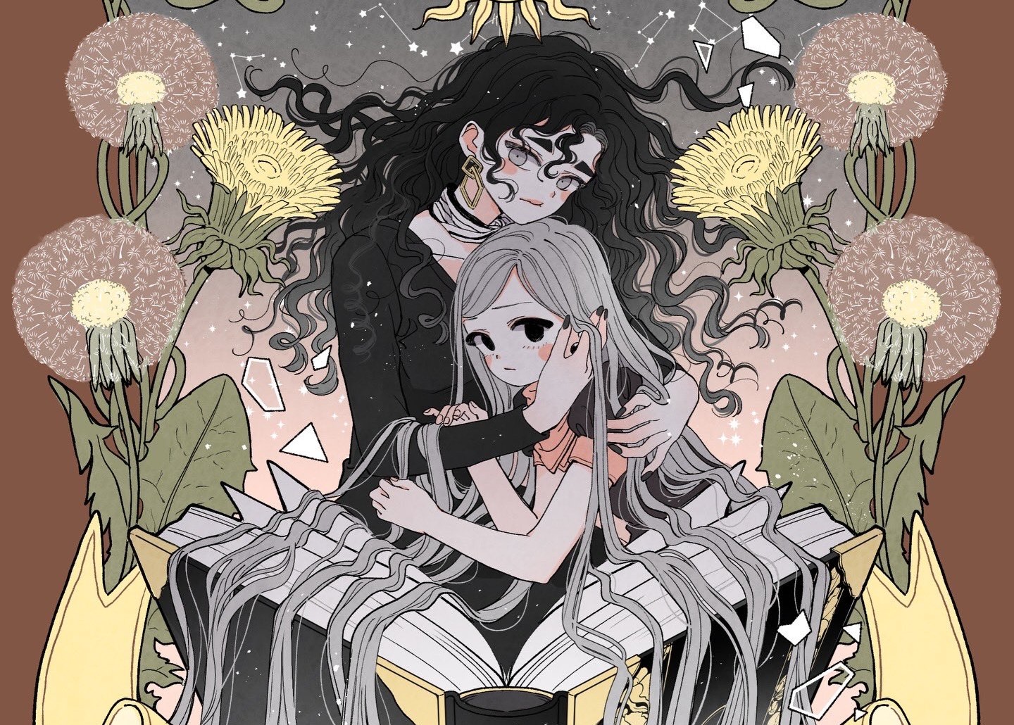 2girls as_yubooh_slumbers black_dress black_eyes black_hair book child constellation curly_hair dress fantasy flower grey_eyes grey_hair hug long_hair long_sleeves multiple_girls nail_polish non-web_source paulinaapc short_sleeves very_long_hair yubooh_rowell