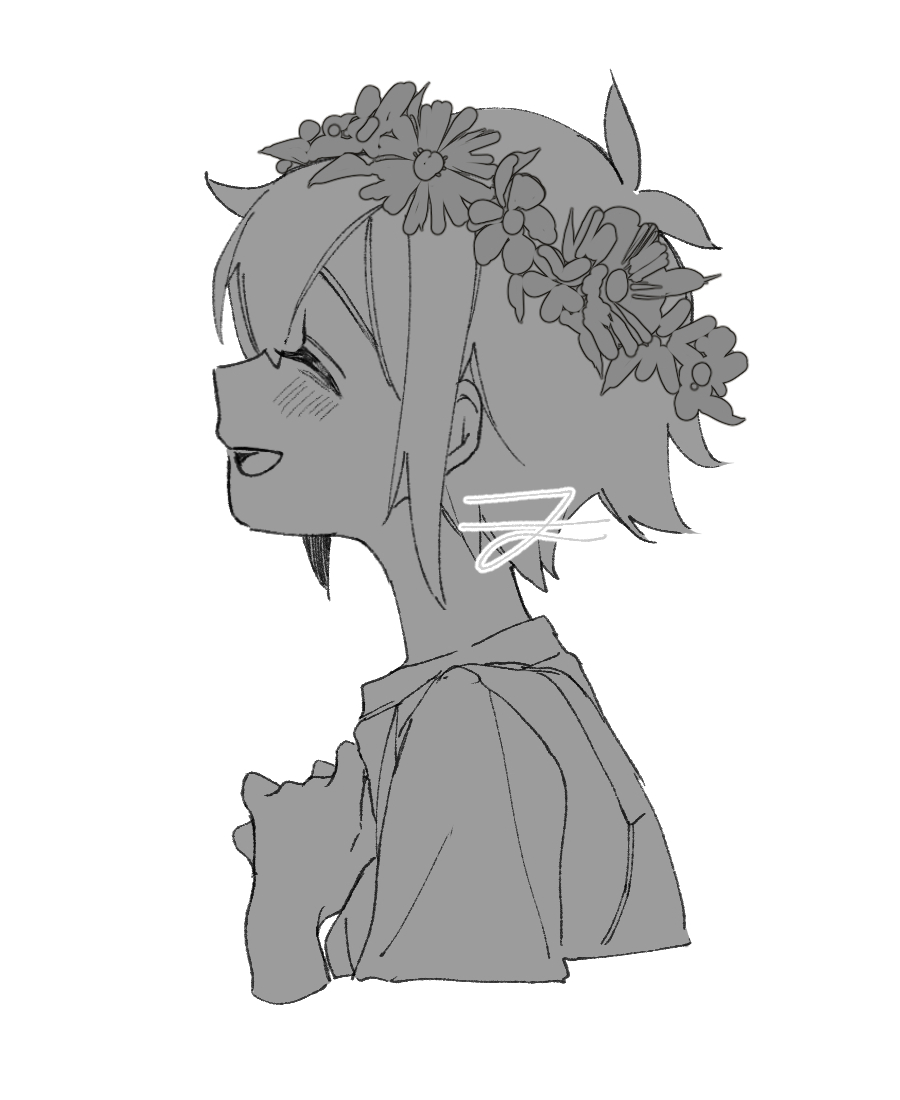 1boy antenna_hair basil_(headspace)_(omori) basil_(omori) blush closed_eyes commentary_request flower_wreath greyscale head_wreath male_focus monochrome omori open_mouth overalls shirt sidelocks simple_background smile solo t-shirt upper_body usagi_uma_te_mu