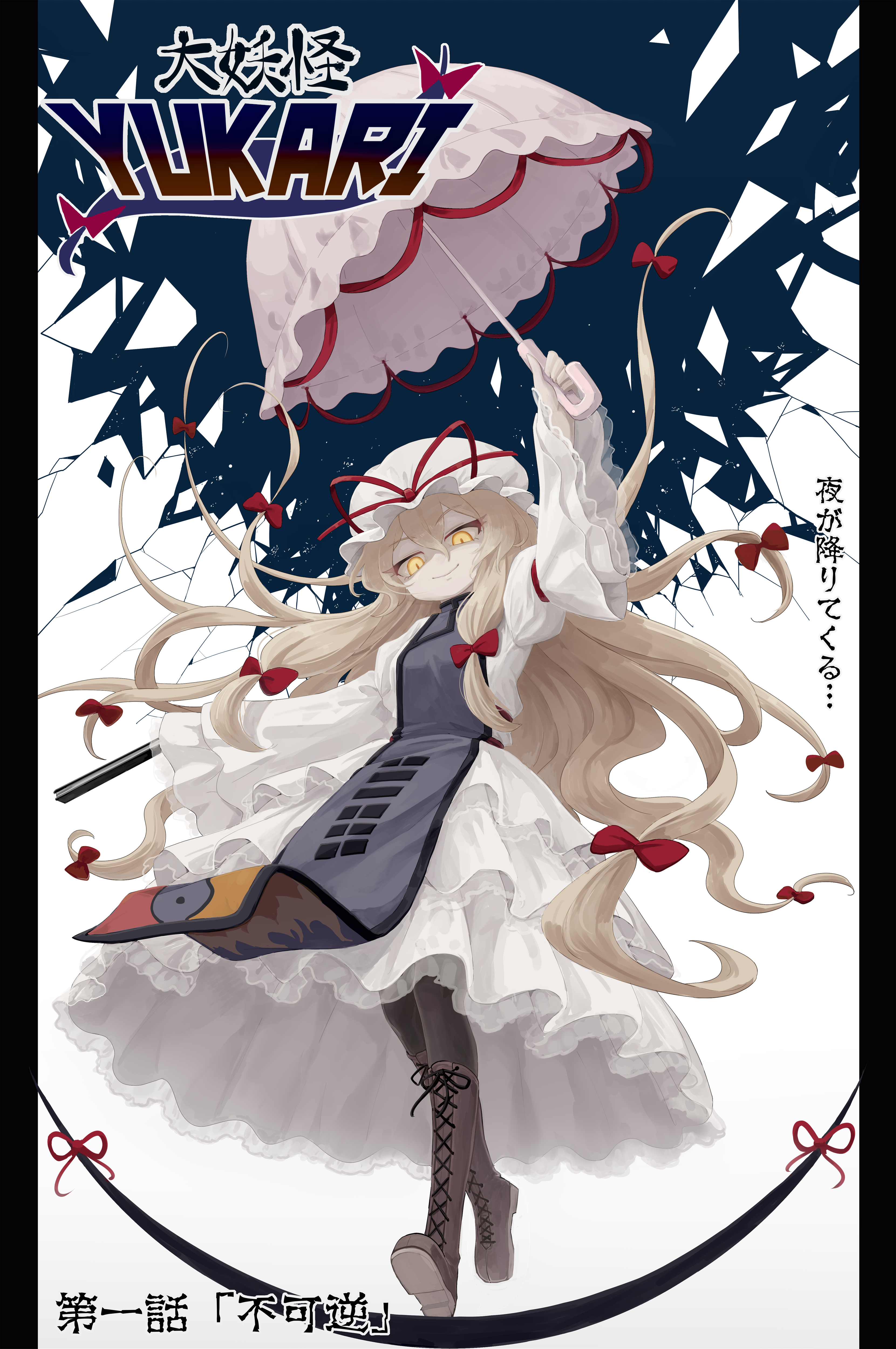 1girl absurdres blonde_hair boots bow brown_boots brown_pantyhose closed_mouth commentary_request dress frilled_dress frills full_body gap_(touhou) hair_bow hat hat_ribbon highres holding holding_umbrella knee_boots lace-up_boots long_hair long_sleeves looking_at_viewer mob_cap multiple_hair_bows pantyhose pillarboxed pink_umbrella purple_tabard ranka_(tonbo) red_bow red_ribbon ribbon shaded_face smile solo tabard touhou translation_request umbrella very_long_hair white_dress white_hat wide_sleeves yakumo_yukari yellow_eyes