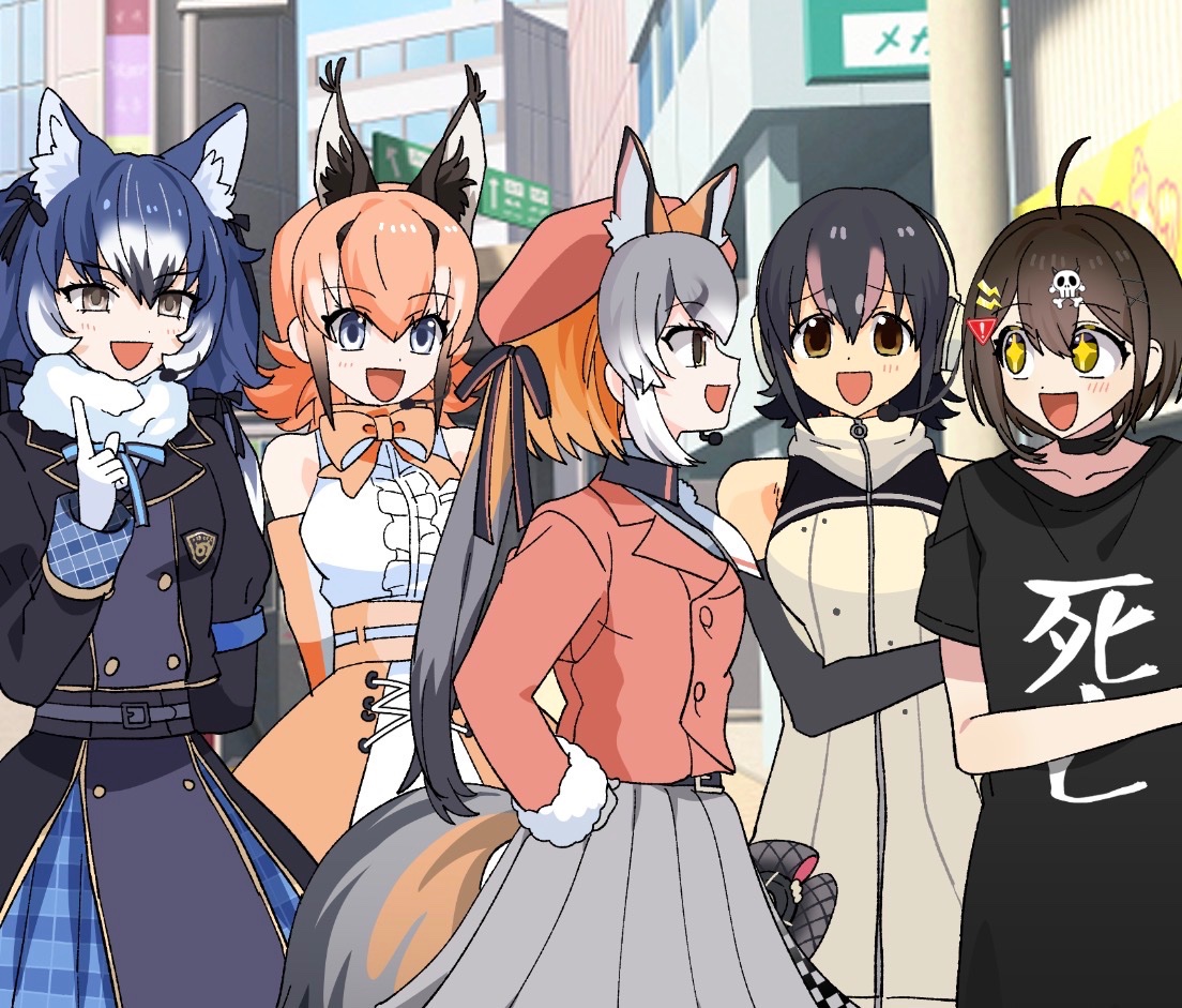 +_+ 5girls animal_ears belt black_hair blue_eyes blue_hair bow bowtie brown_hair building caracal_(kemono_friends) cat_ears cat_girl choker commentary_request dire_wolf_(kemono_friends) elbow_gloves extra_ears flag-chan fox_ears fox_girl fox_tail gloves grey_eyes grey_hair hair_ornament hairpin hat headphones hood hoodie humboldt_penguin_(kemono_friends) island_fox_(kemono_friends) jacket japari_symbol kemono_friends kemono_friends_v_project long_hair microphone multiple_girls neck_ribbon necktie official_art orange_hair outdoors penguin_girl ribbon scarf shirt short_hair skirt skull sleeveless sleeveless_shirt t-shirt tail virtual_youtuber wolf_ears wolf_girl yellow_eyes zenryoku_kaihi_flag-chan! zipper